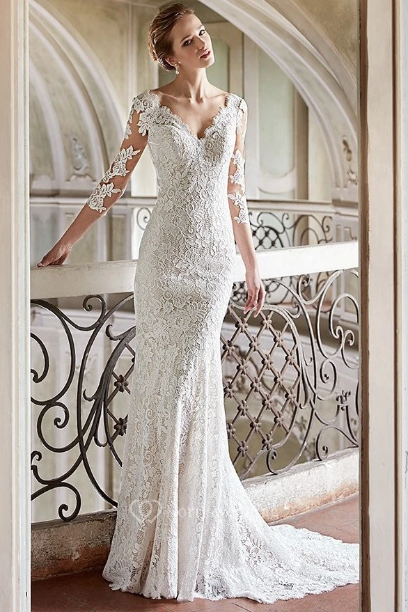 Sheath Maxi V-Neck 3-4-Sleeve Lace Elegant Wedding Dress With Appliques And Backless Design