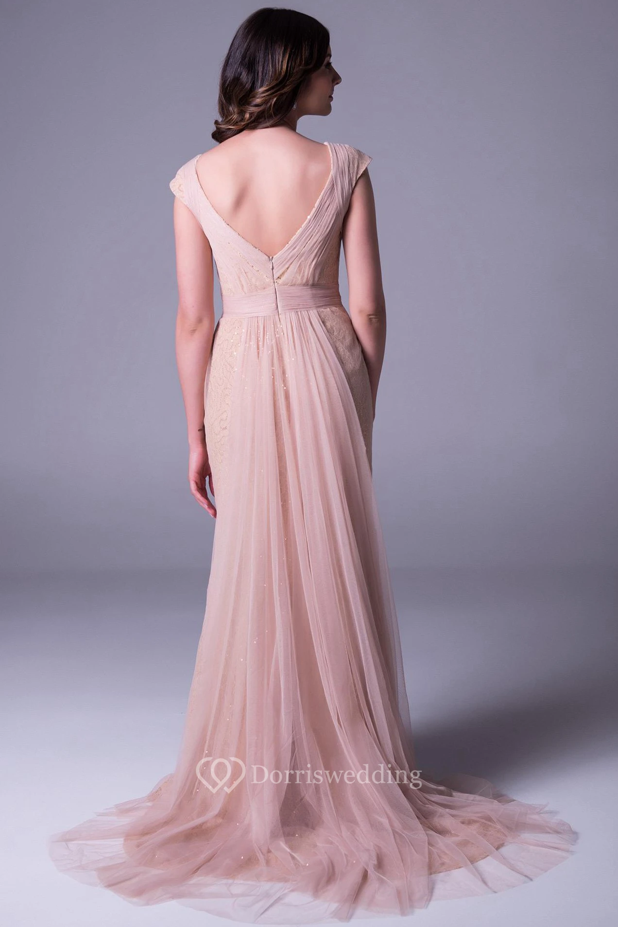 Sheath Maxi V-Neck Beaded Cap-Sleeve Tulle Prom Dress With Waist Jewellery