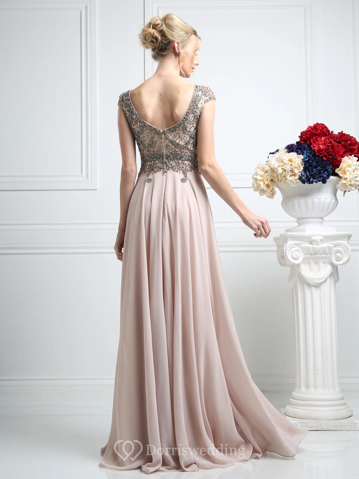Sheath Maxi V-Neck Cap-Sleeve Chiffon Low-V Back Dress With Beading And Pleats