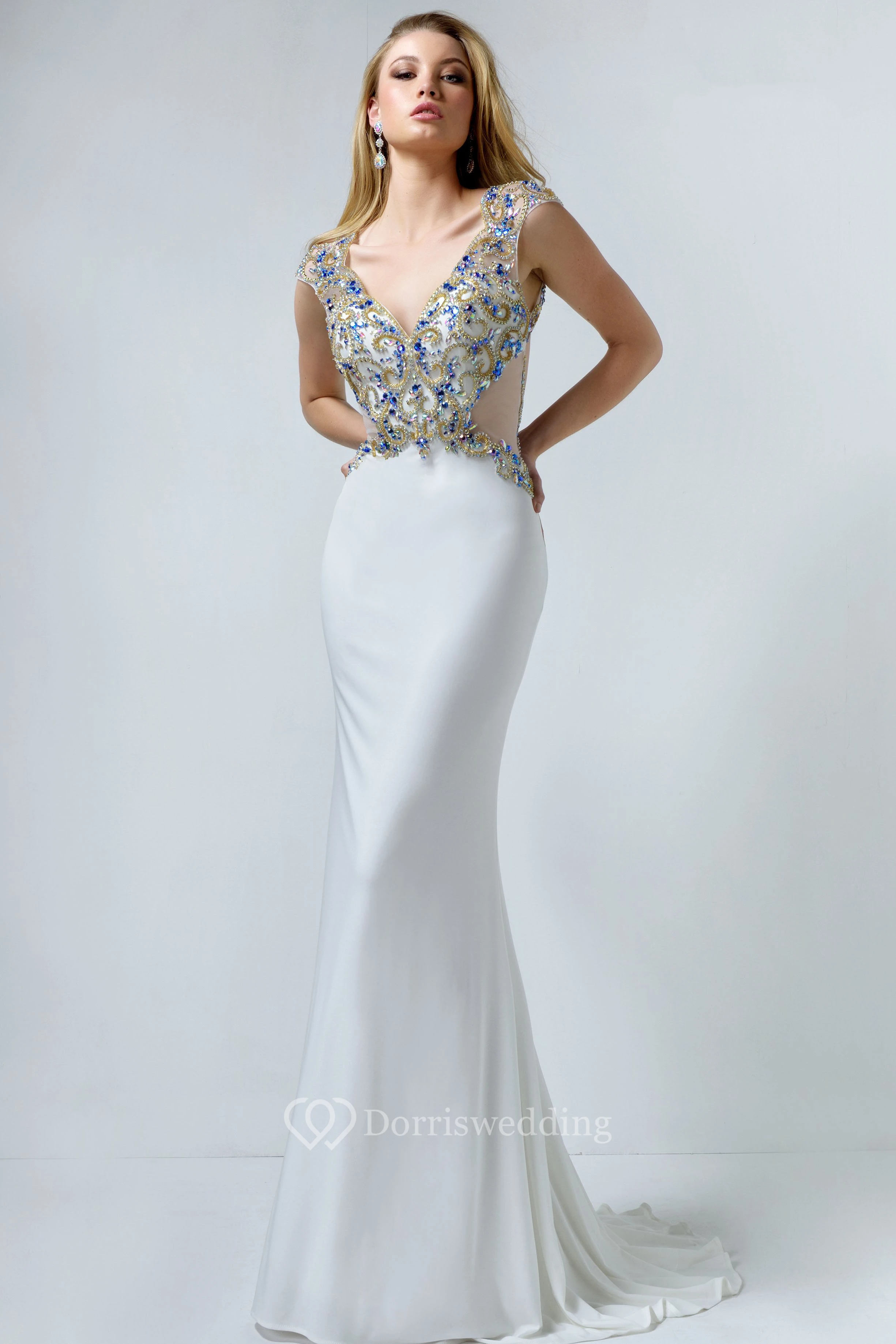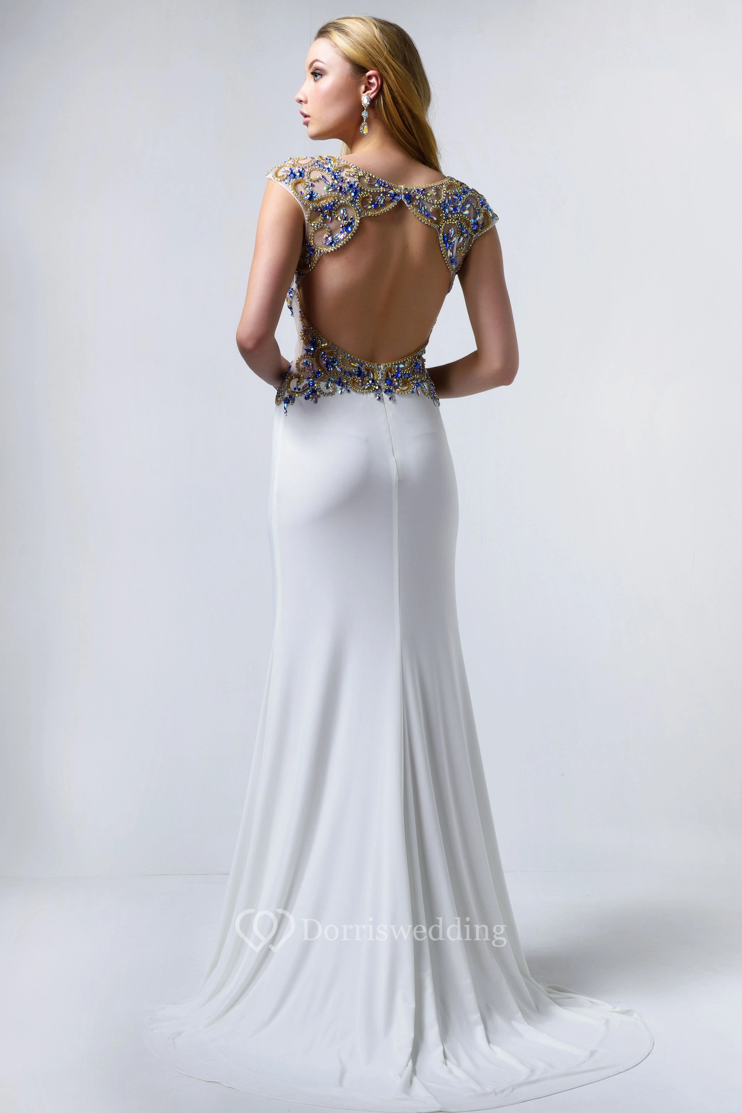 Sheath Maxi V-Neck Cap-Sleeve Jersey Keyhole Dress With Crystal Detailing