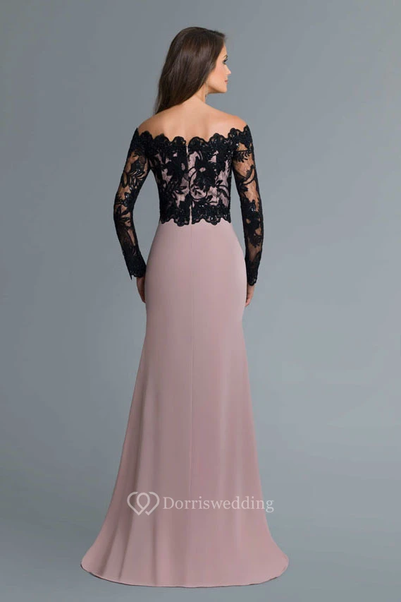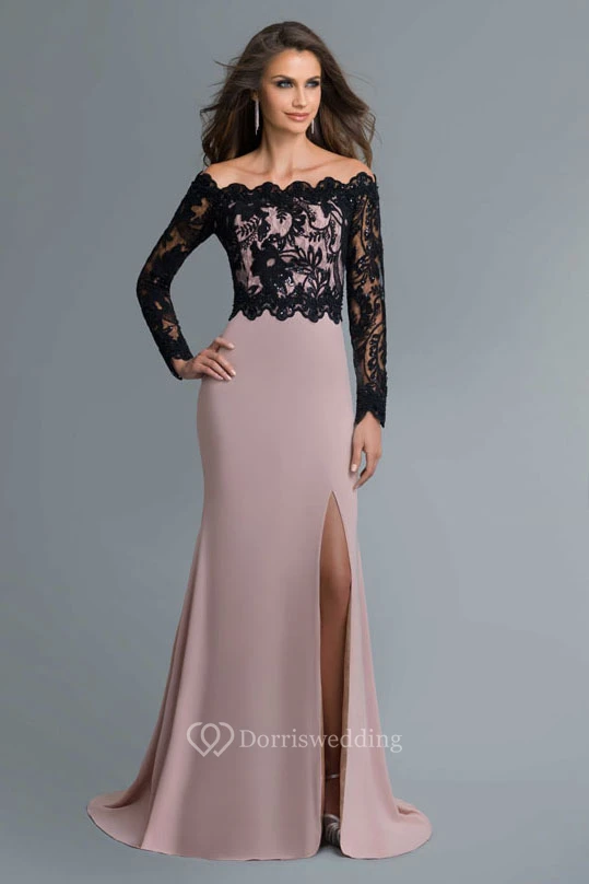 Sheath Off-The-Shoulder Long Sleeve Jersey Lace Zipper Dress With Split Front