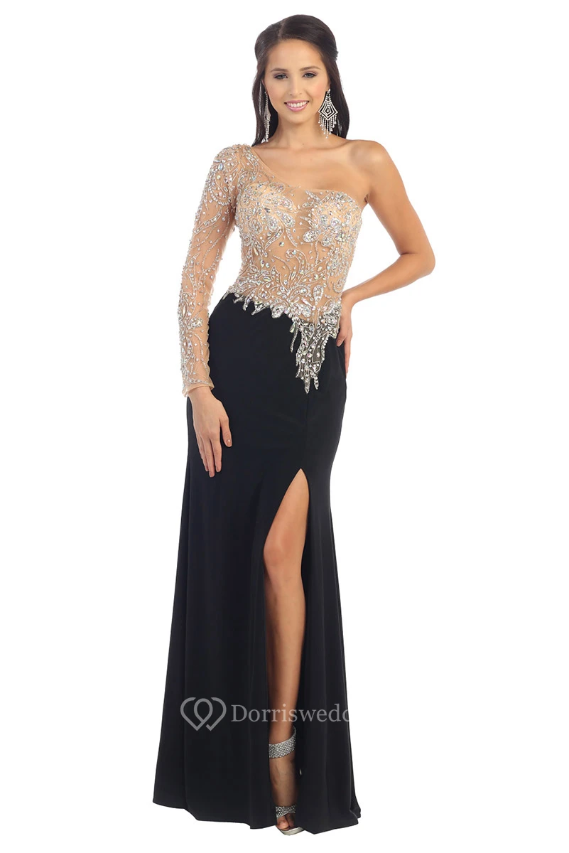 Sheath One-Shoulder Illusion Long Sleeve Jersey Dress With Split Front And Beading