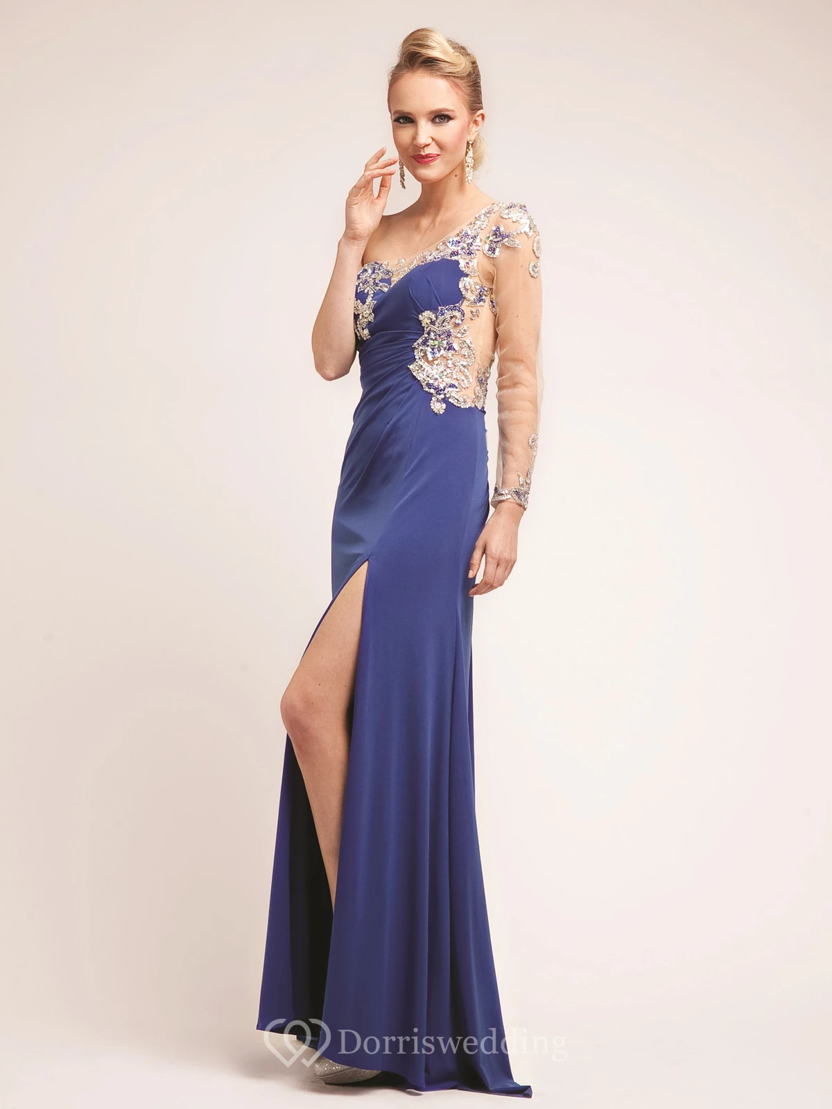 Sheath One-Shoulder Sleeveless Jersey Dress With Split Front And Beading