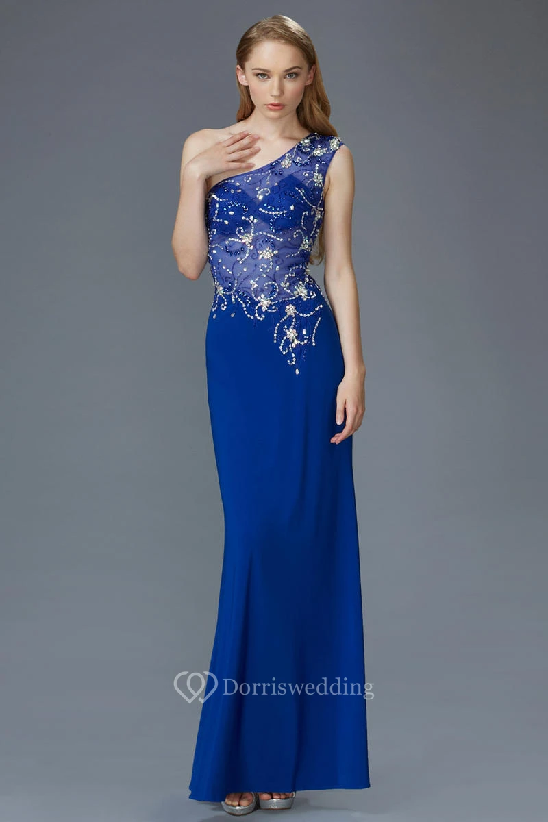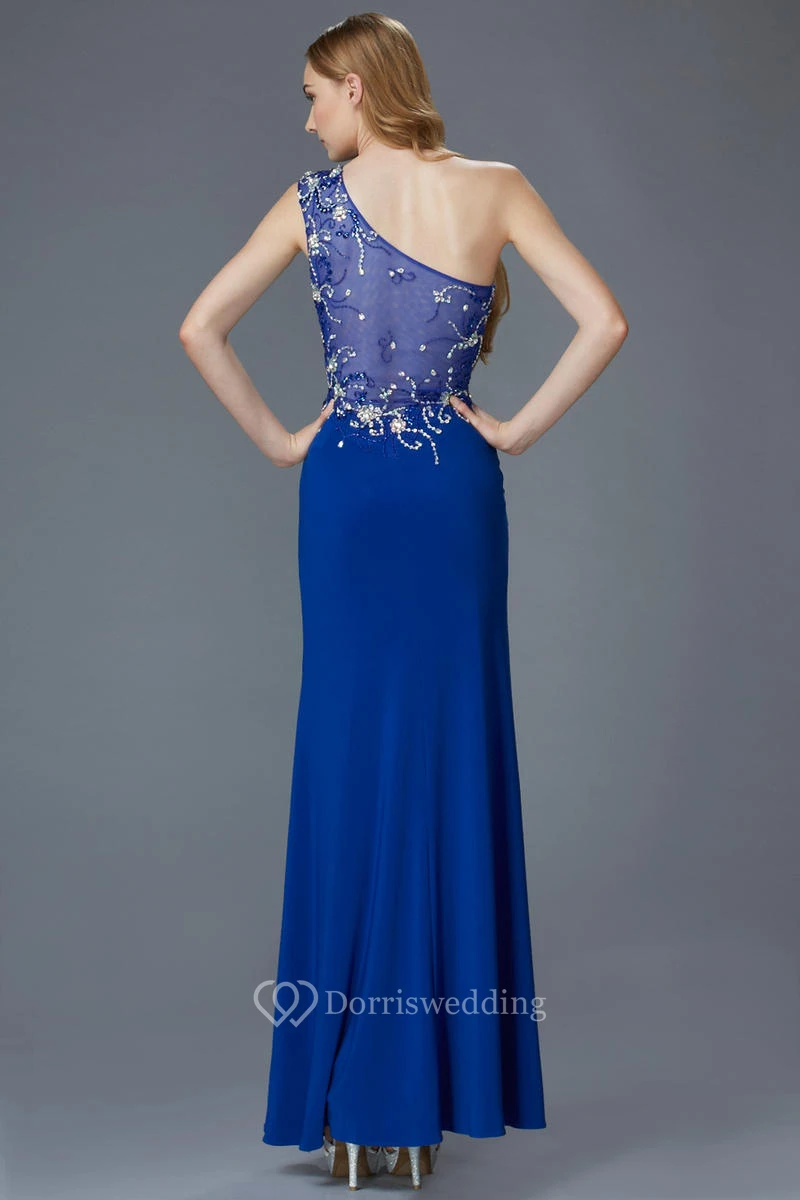 Sheath One-Shoulder Sleeveless Jersey Illusion Dress With Beading