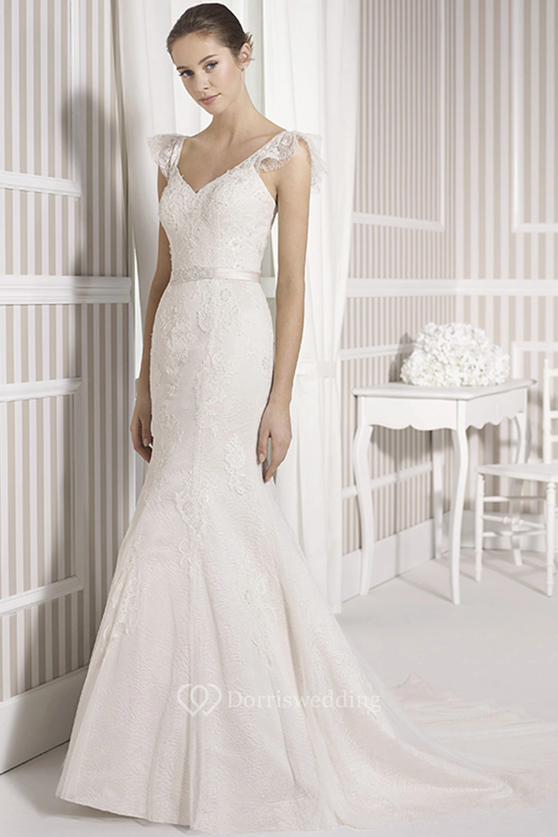 Sheath Poet-Sleeve Long V-Neck Appliqued Lace Wedding Dress With Court Train