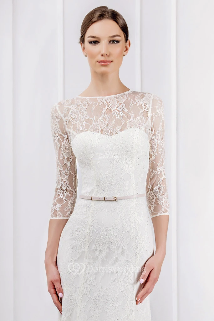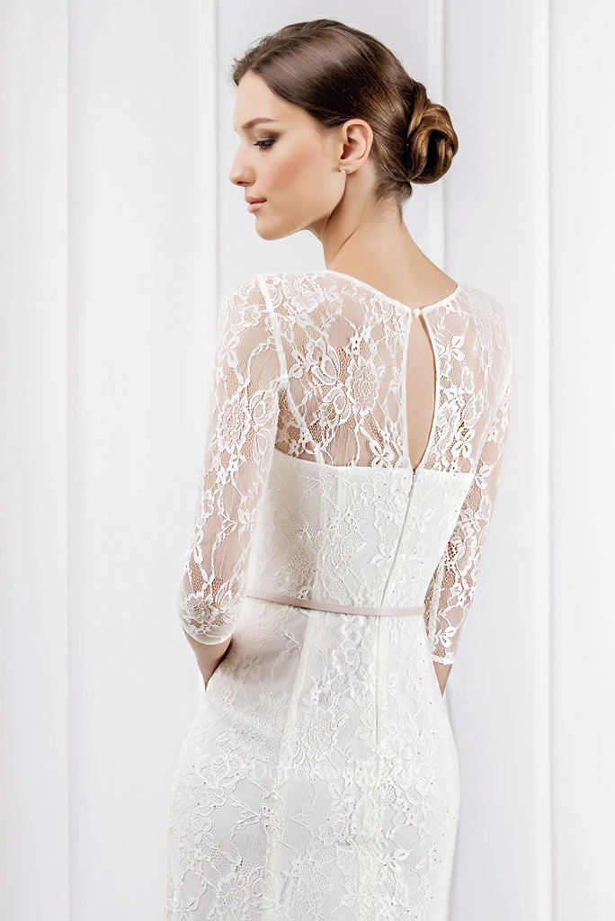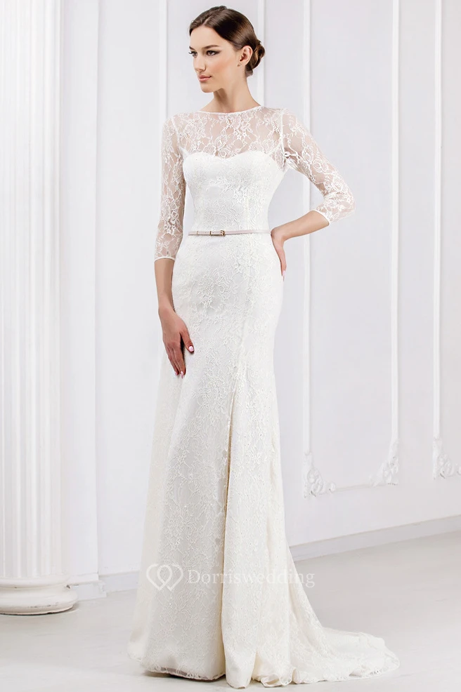 Sheath Ribboned Jewel Neck 3-4 Sleeve Lace Wedding Dress With Brush Train