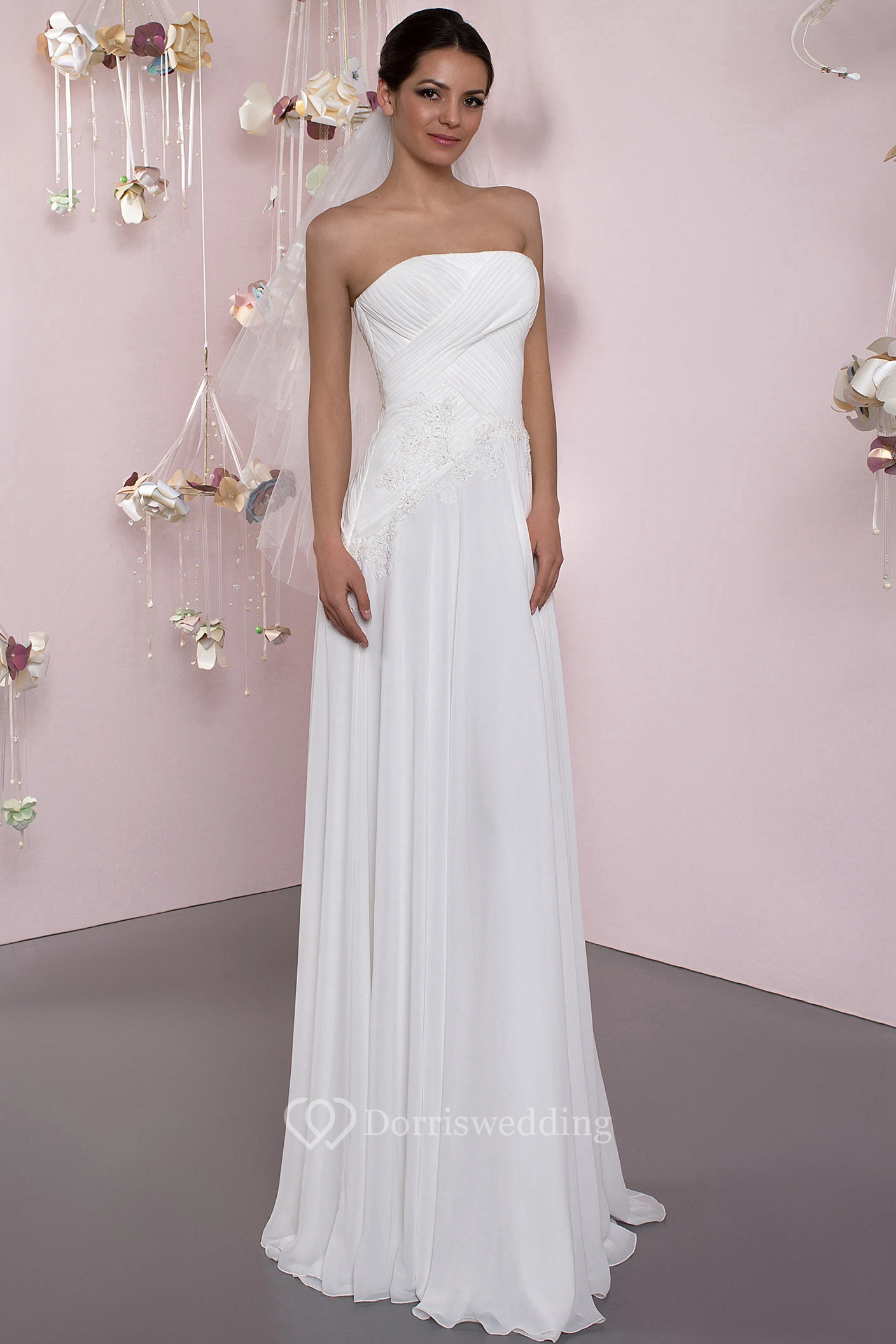 Sheath Ruched Strapless Sleeveless Long Chiffon Wedding Dress With Corset Back And Pleats