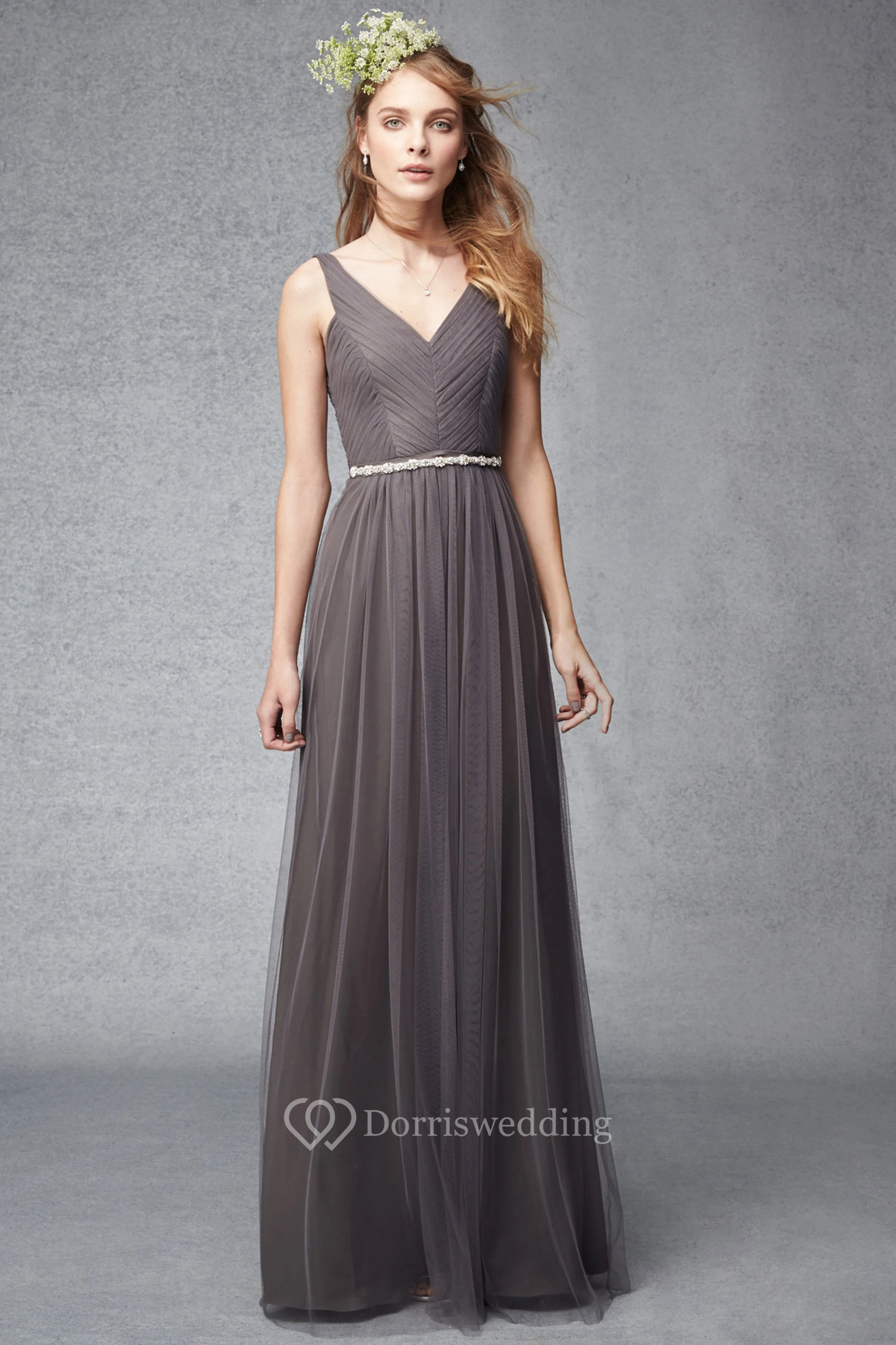 Sheath Ruched V-Neck Sleeveless Floor-Length Tulle Bridesmaid Dress With Waist Jewellery