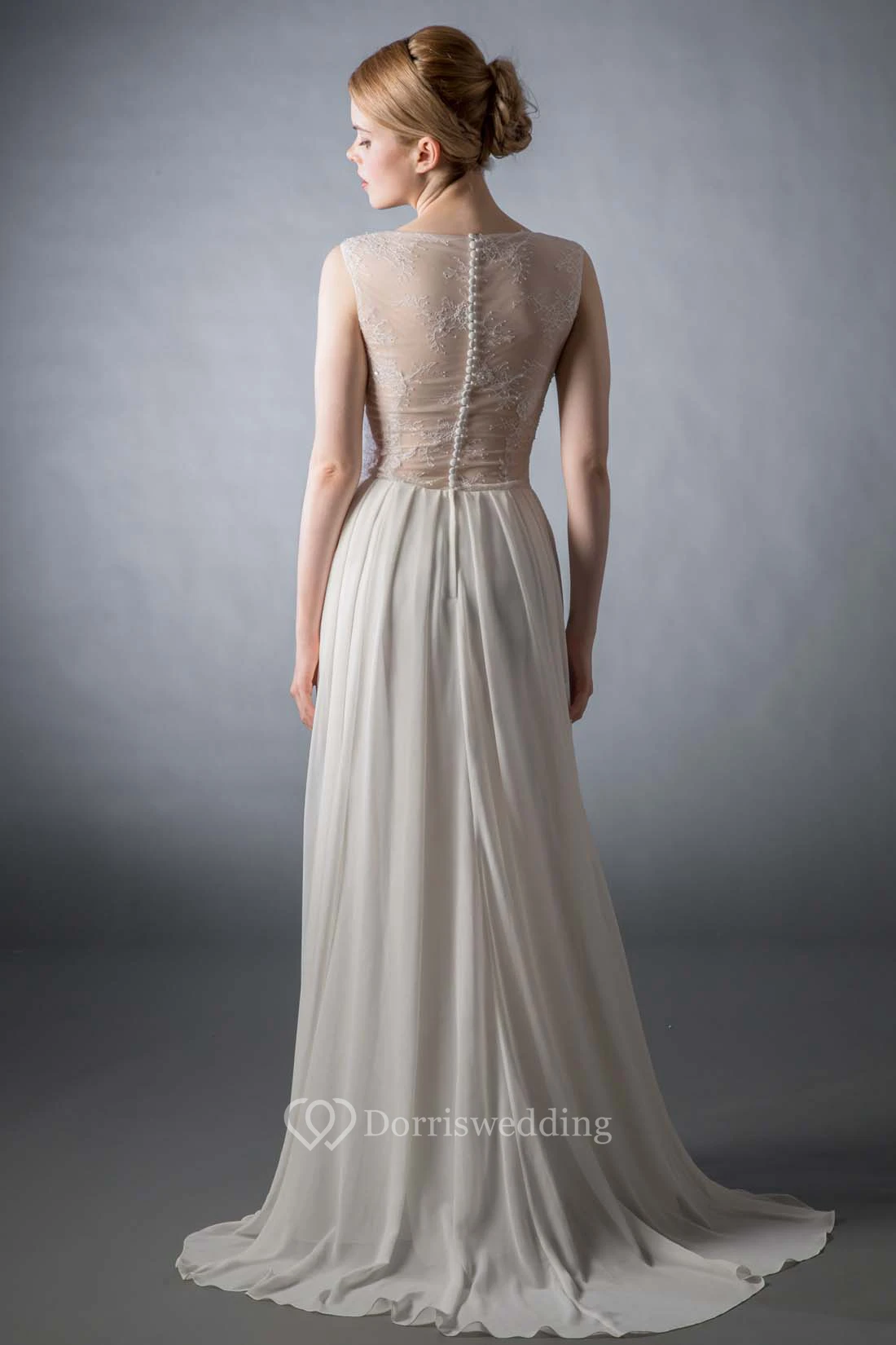 Sheath Scoop Cap-Sleeve Beaded Floor-Length Satin&Chiffon Wedding Dress With Illusion Back And Sweep Train