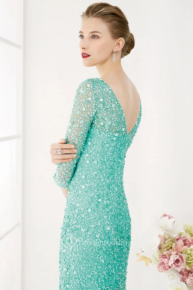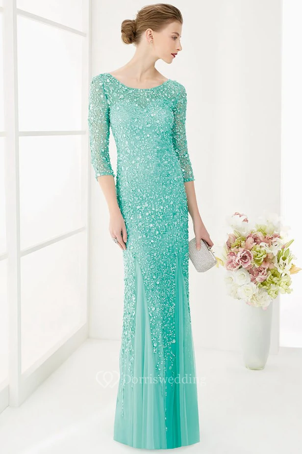 Sheath Scoop-Neck 3-4-Sleeve Maxi Sequins&Tulle Prom Dress
