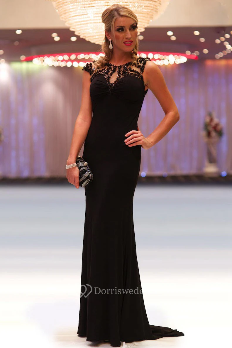 Sheath Scoop-Neck Beaded Cap-Sleeve Long Chiffon Prom Dress With Pleats