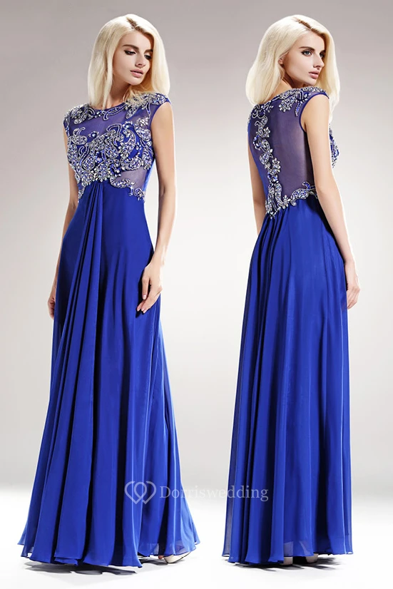 Sheath Scoop-Neck Cap-Sleeve Empire Chiffon Illusion Dress With Beading And Pleats