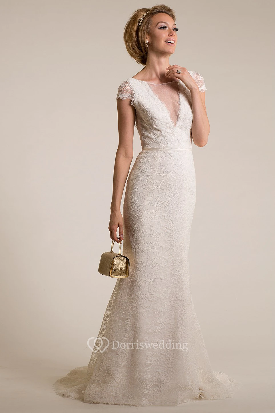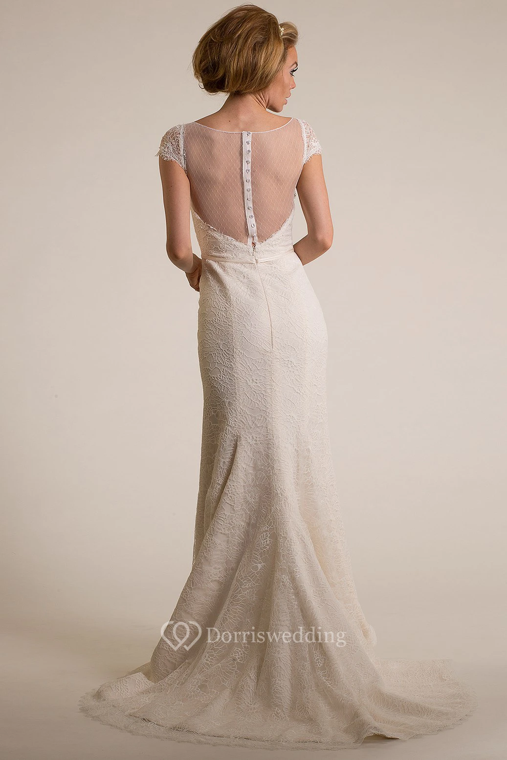 Sheath Scoop-Neck Cap-Sleeve Lace Wedding Dress With Illusion