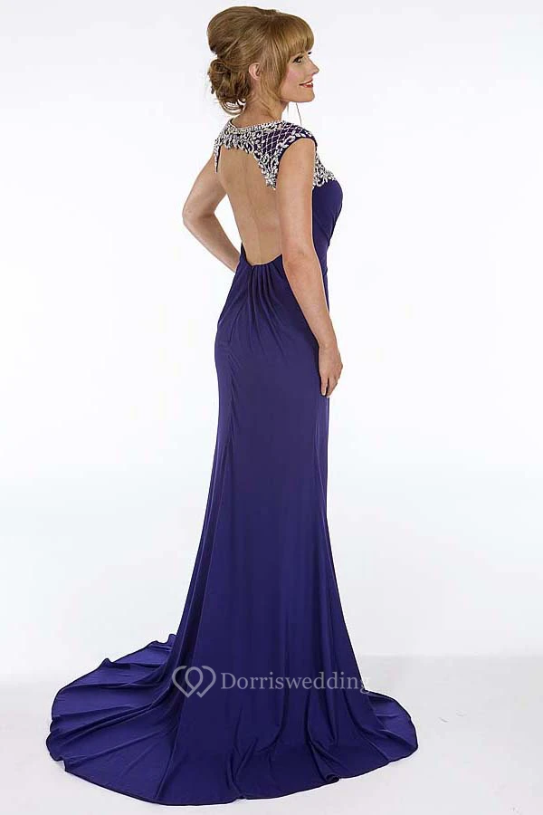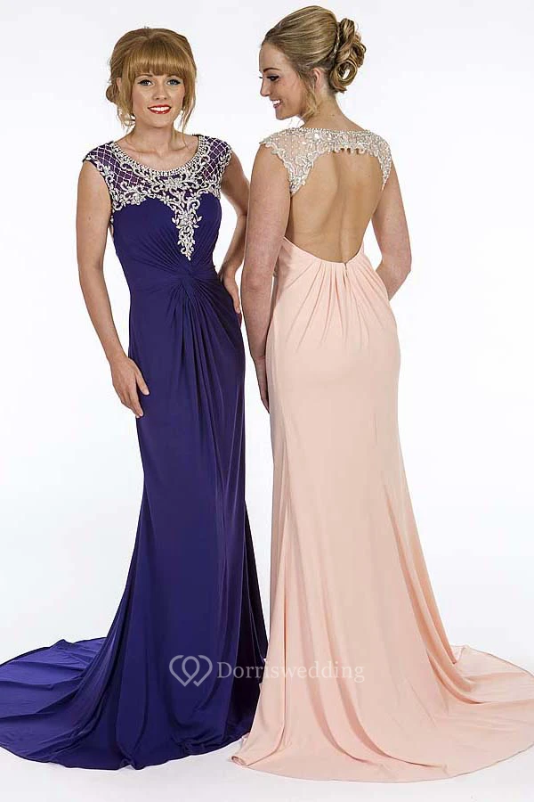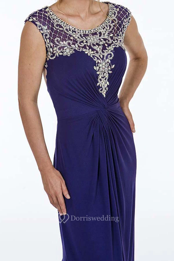 Sheath Scoop-Neck Floor-Length Cap-Sleeve Ruched Chiffon Prom Dress With Beading