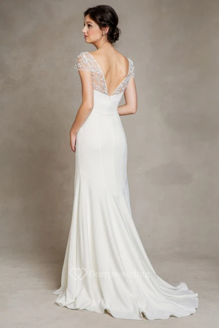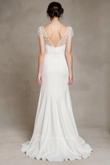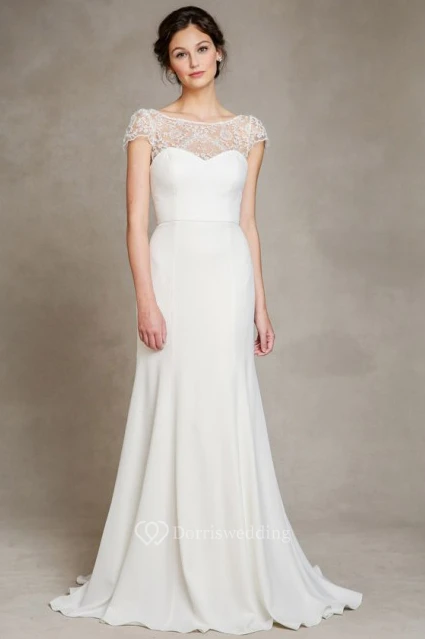 Sheath Scoop-Neck Floor-Length Cap-Sleeve Satin Wedding Dress