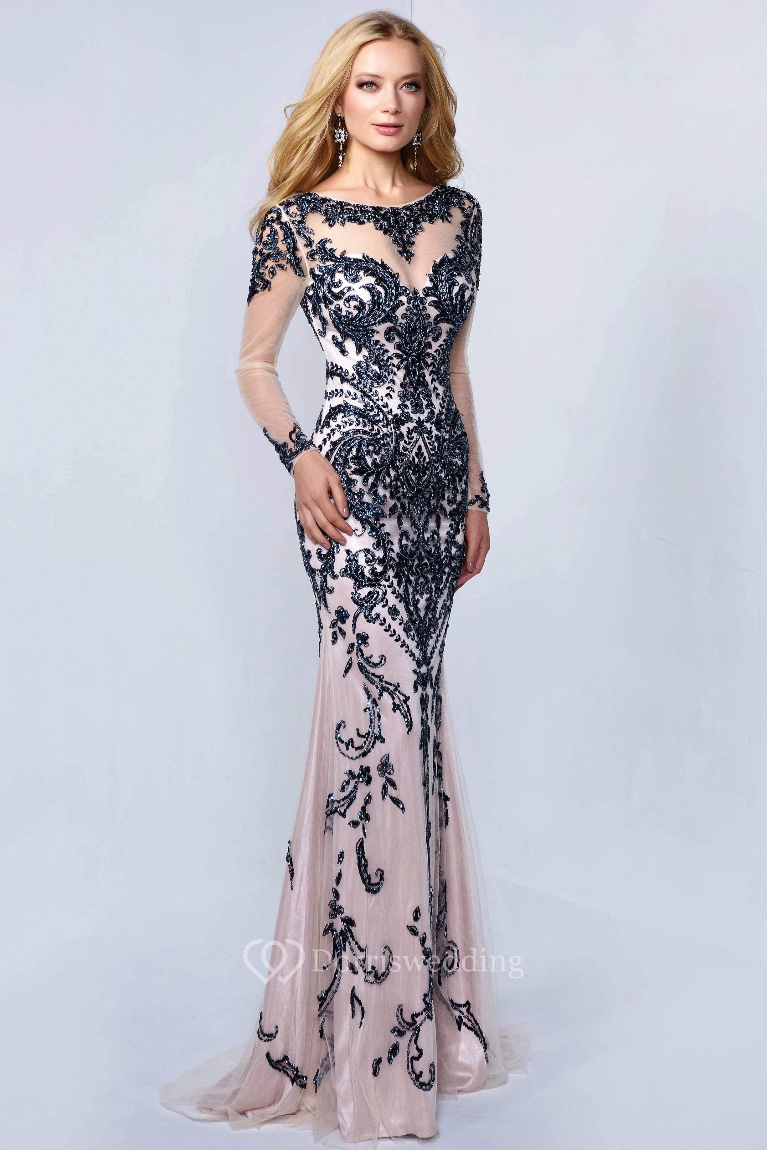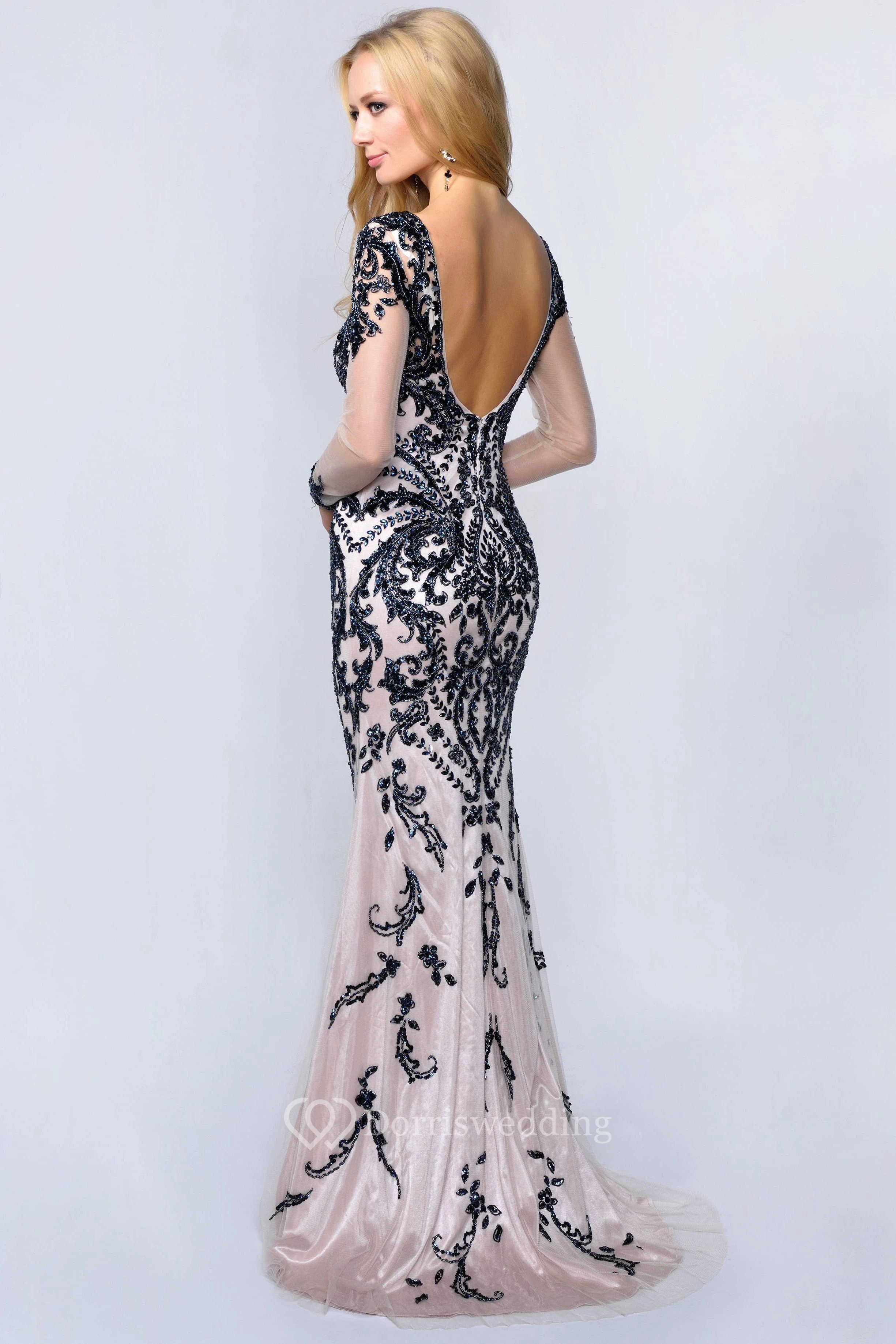 Sheath Scoop-Neck Illusion Long Sleeve Deep-V Back Dress With Beading