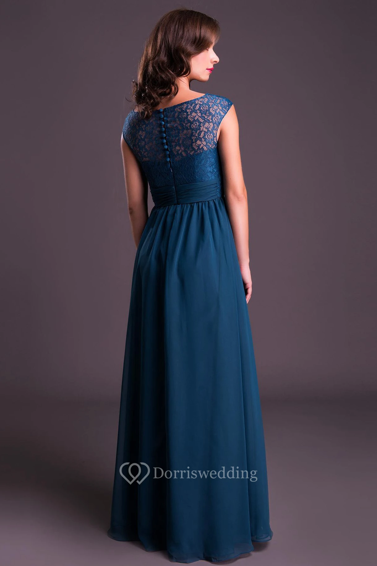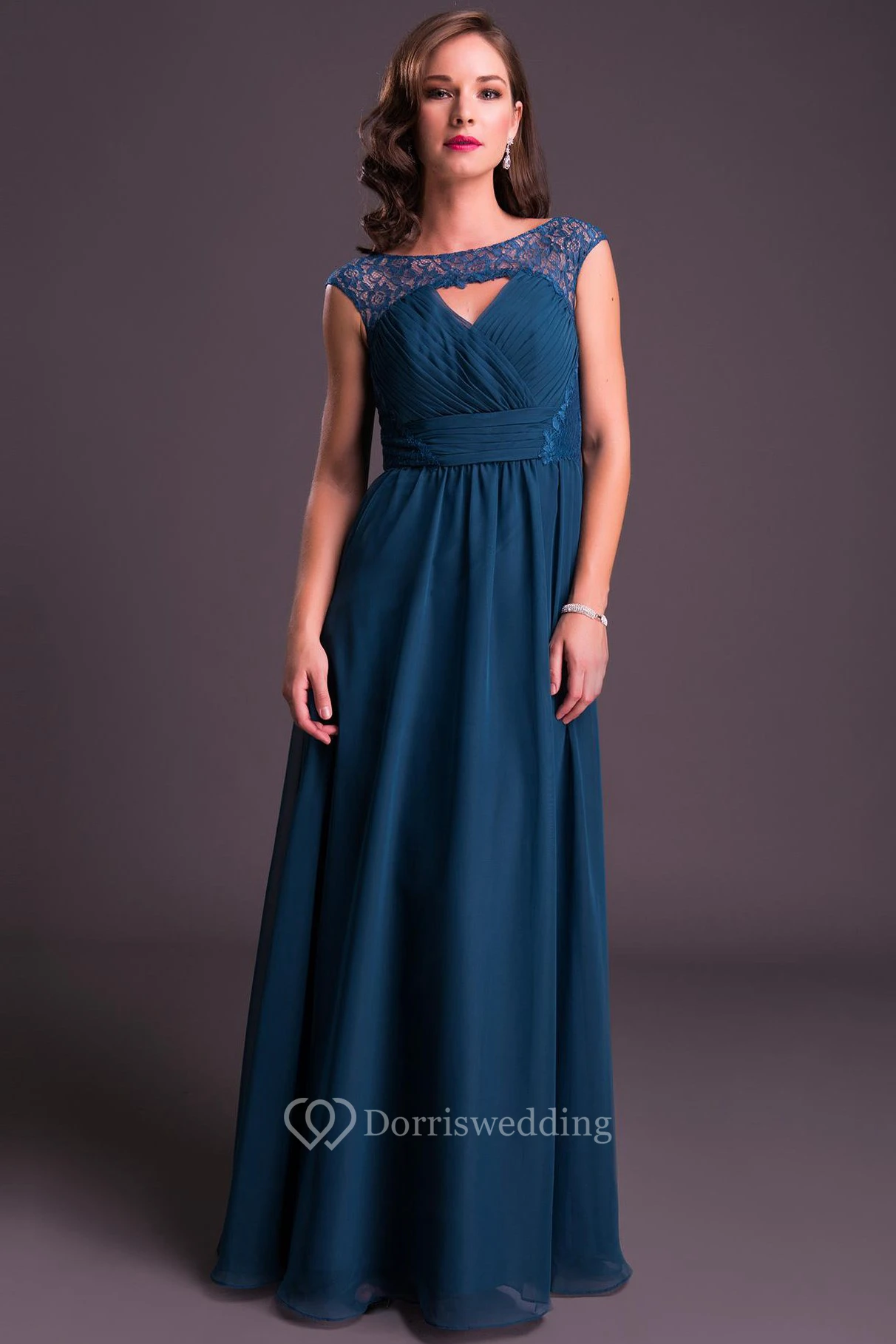 Sheath Scoop-Neck Lace Long Cap-Sleeve Chiffon Prom Dress With Ruching