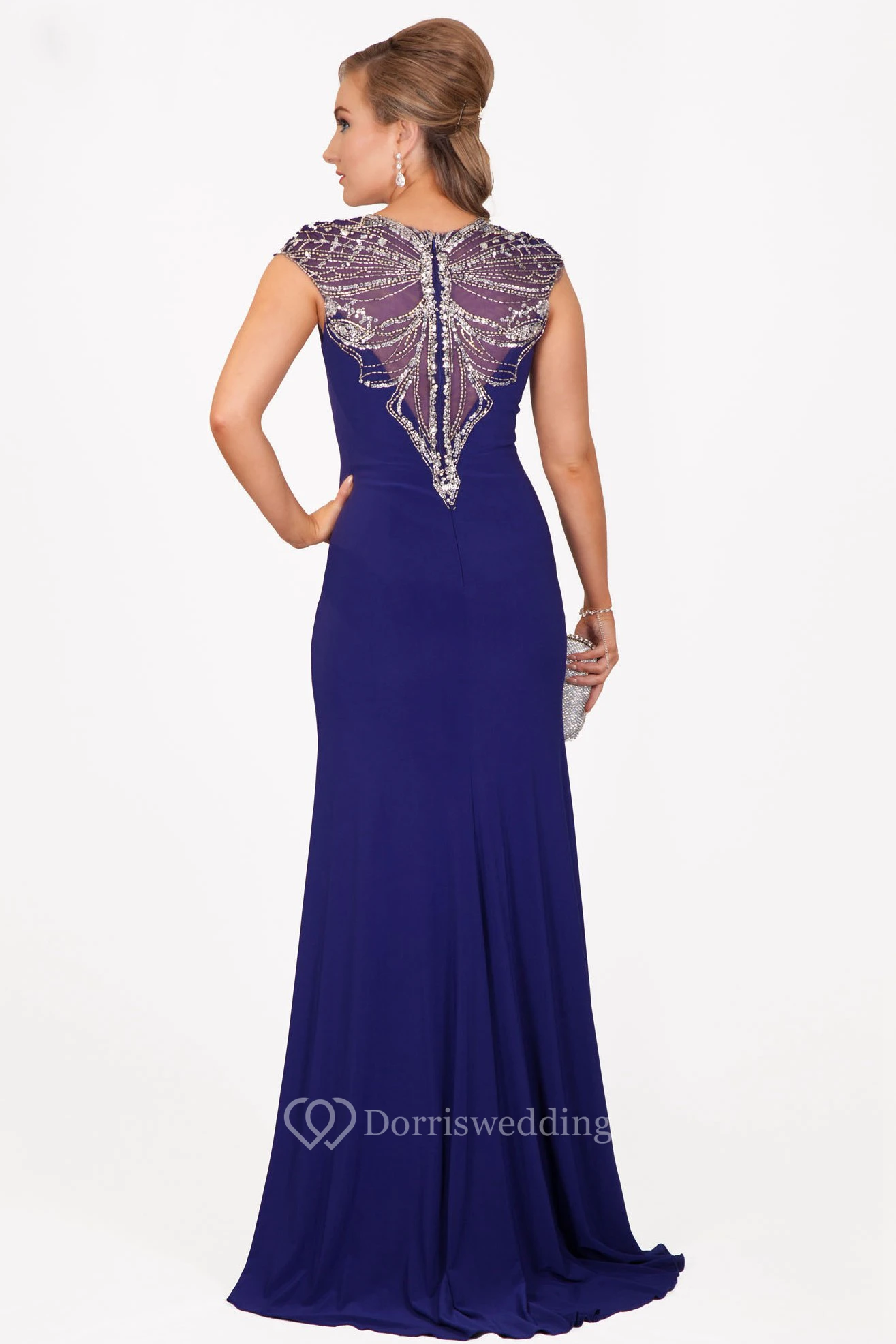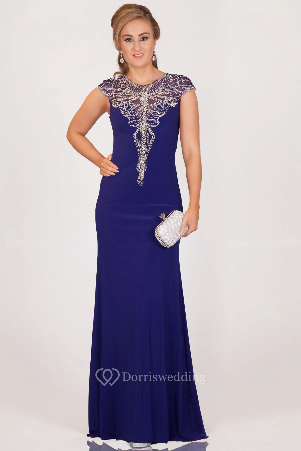Sheath Scoop-Neck Long Beaded Cap-Sleeve Jersey Prom Dress