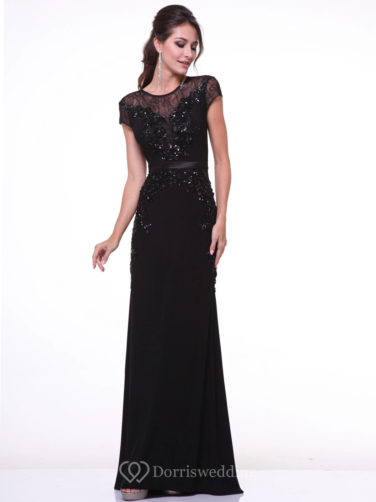 Sheath Scoop-Neck Short Sleeve Chiffon Dress With Beading And Lace