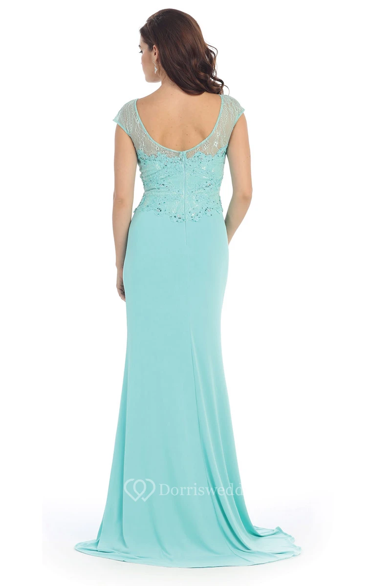 Sheath Scoop-Neck Short Sleeve Jersey Low-V Back Dress With Lace And Appliques