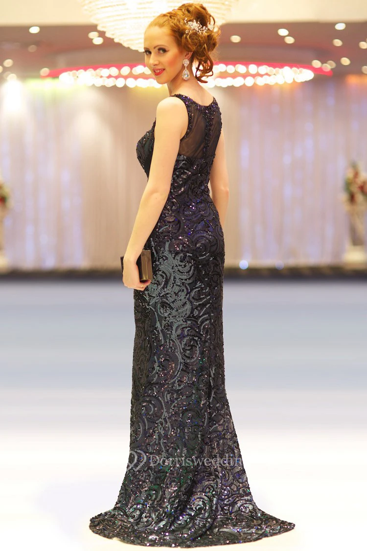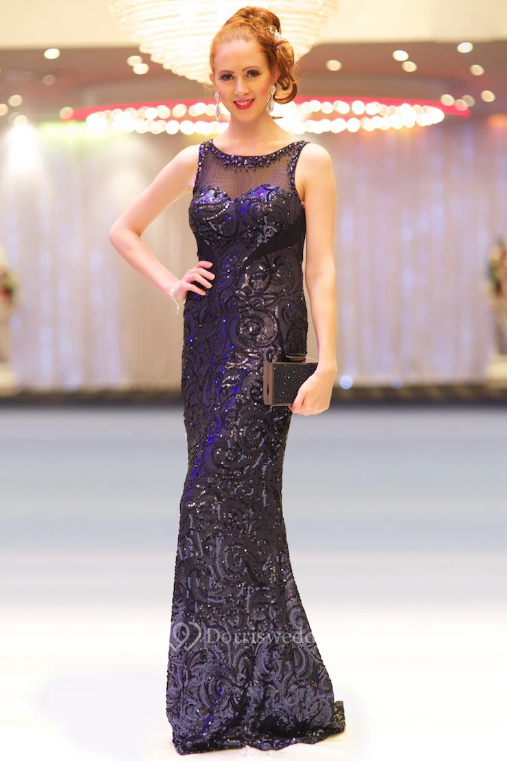 Sheath Scoop-Neck Sleeveless Floor-Length Beaded Sequins Prom Dress