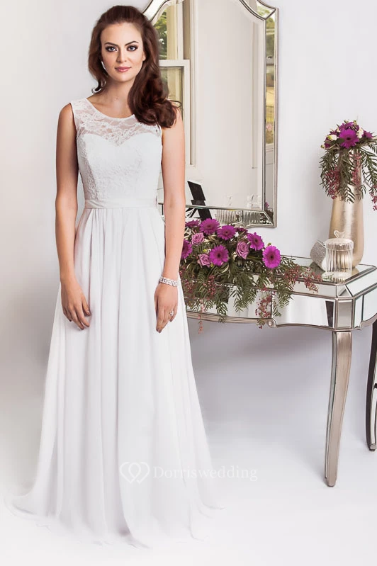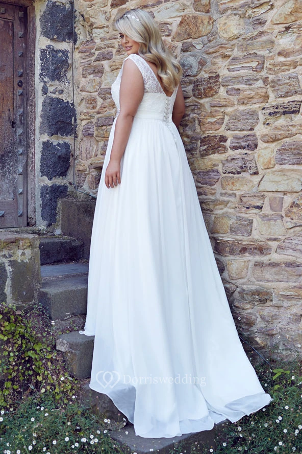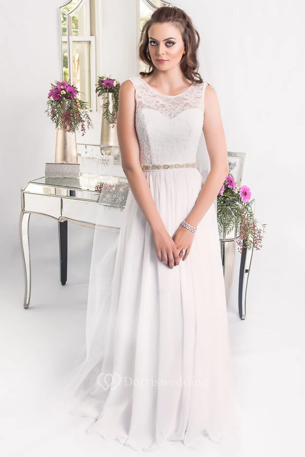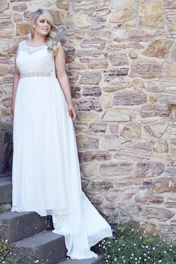 Sheath Scoop-Neck Sleeveless Floor-Length Jeweled Chiffon Plus Size Wedding Dress With Appliques And Corset Back