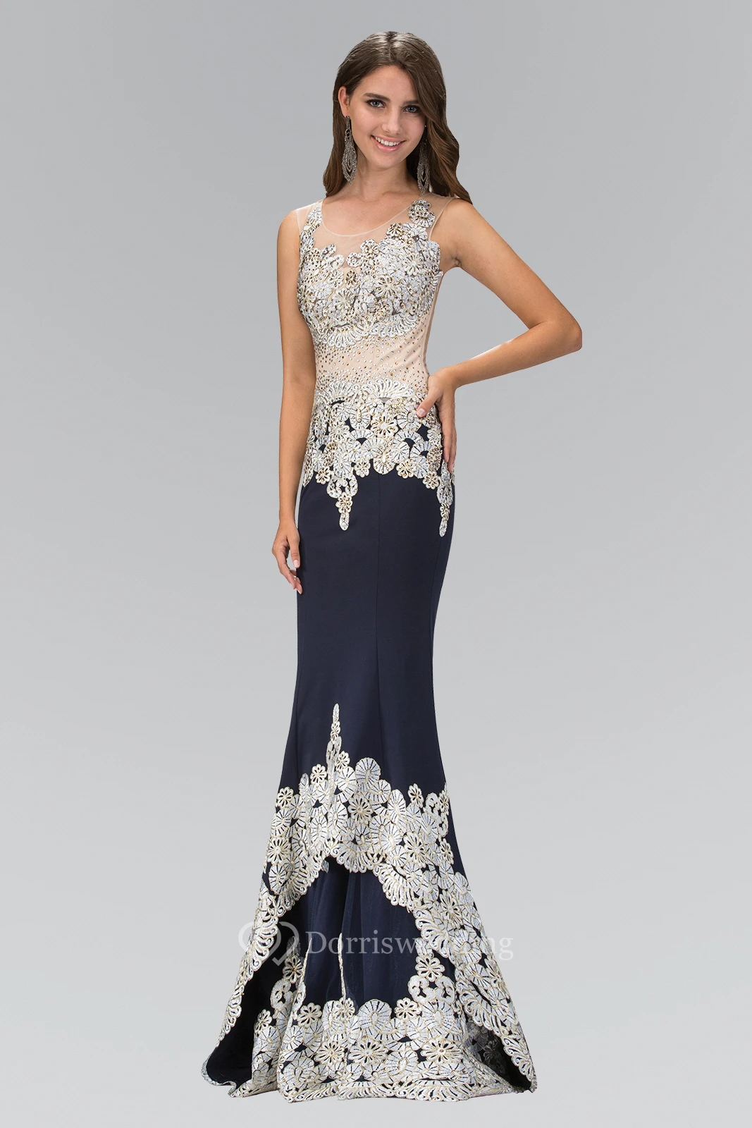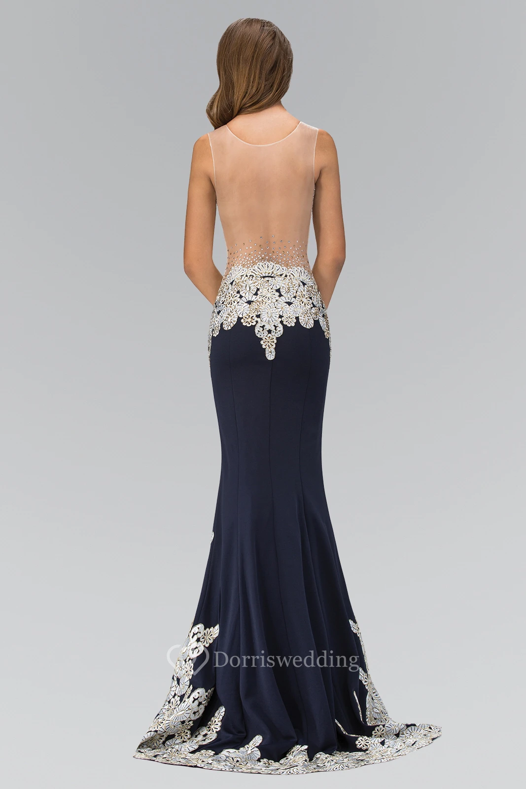 Sheath Scoop-Neck Sleeveless Jersey Illusion Dress With Appliques And Sequins