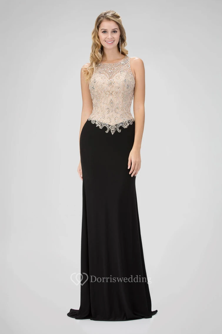 Sheath Scoop-Neck Sleeveless Jersey Illusion Dress With Beading