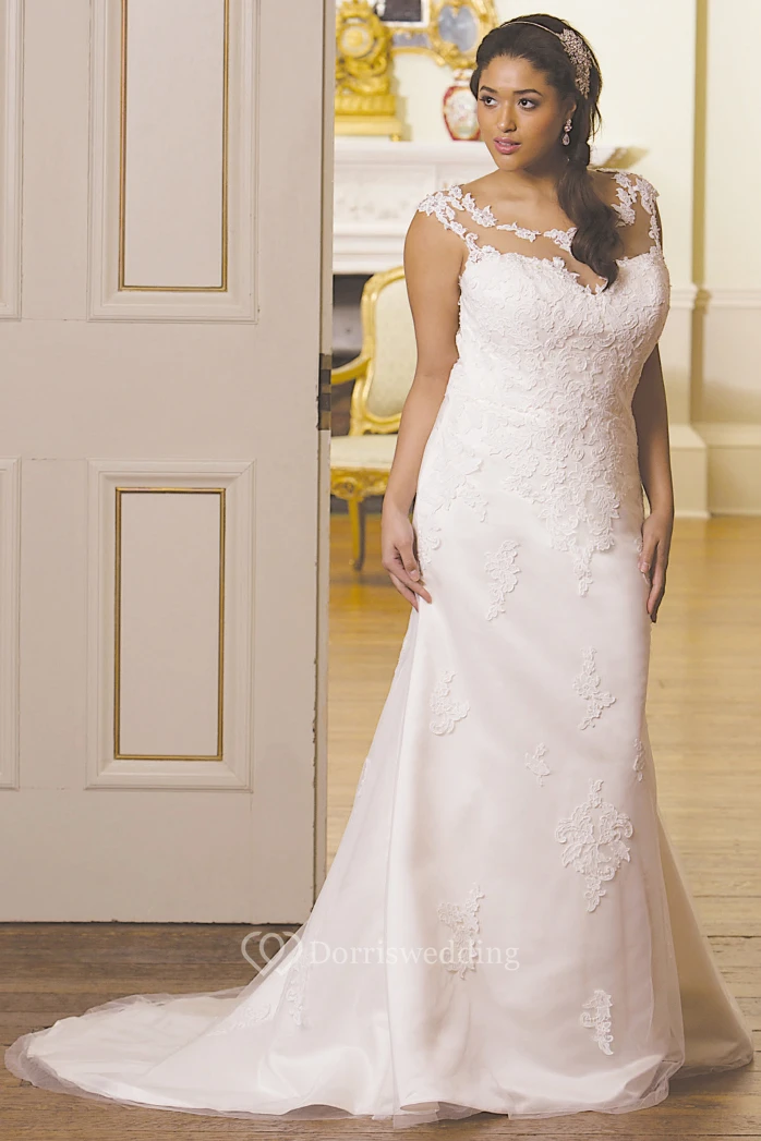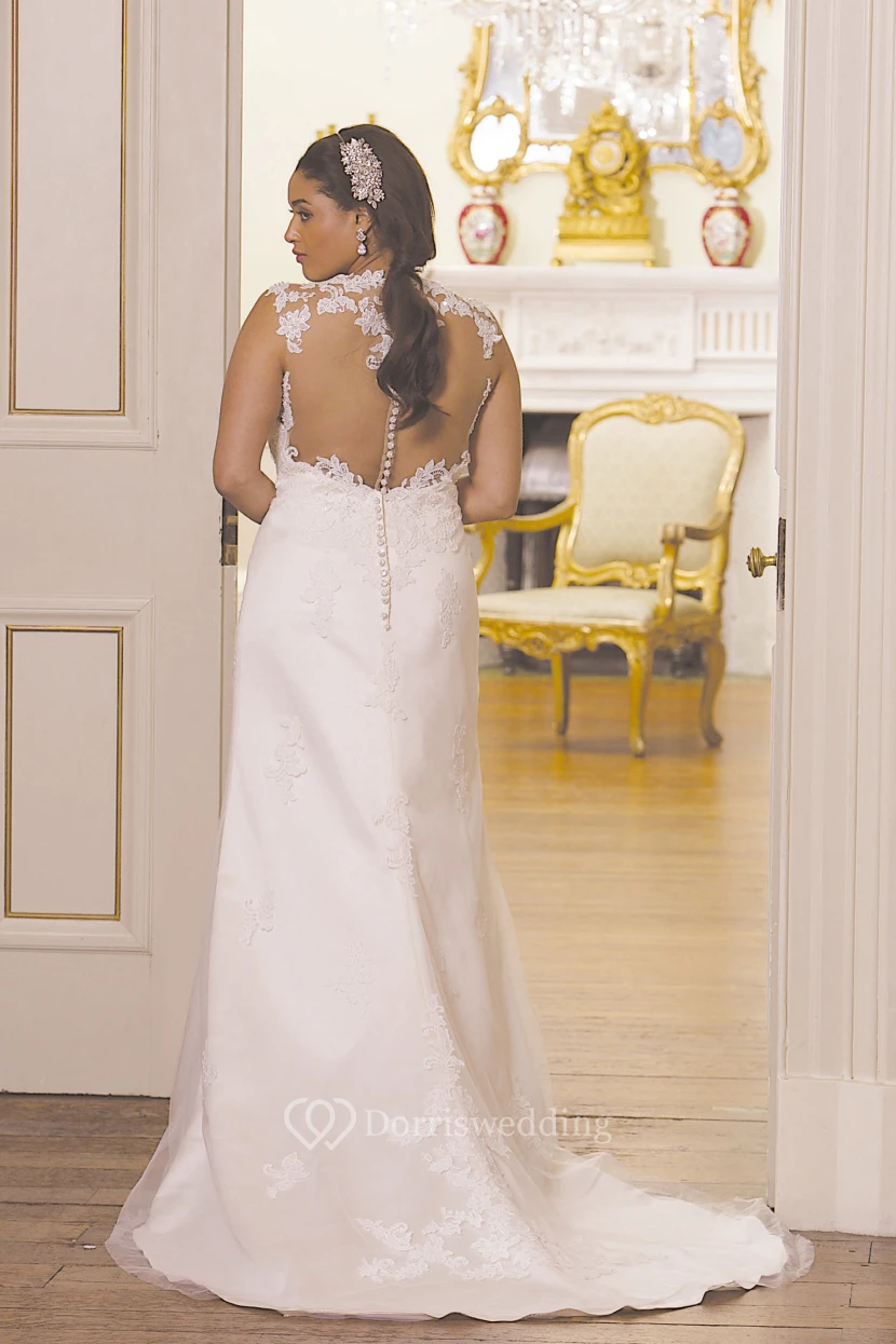 Sheath Scoop-Neck Sleeveless Satin&Tulle Plus Size Wedding Dress With Illusion