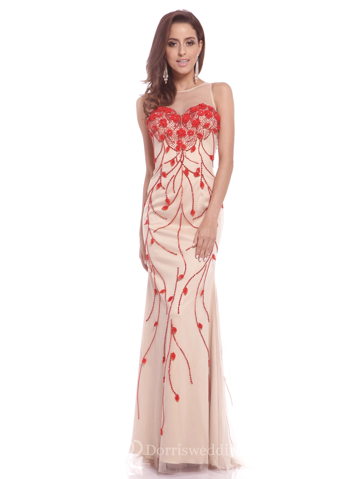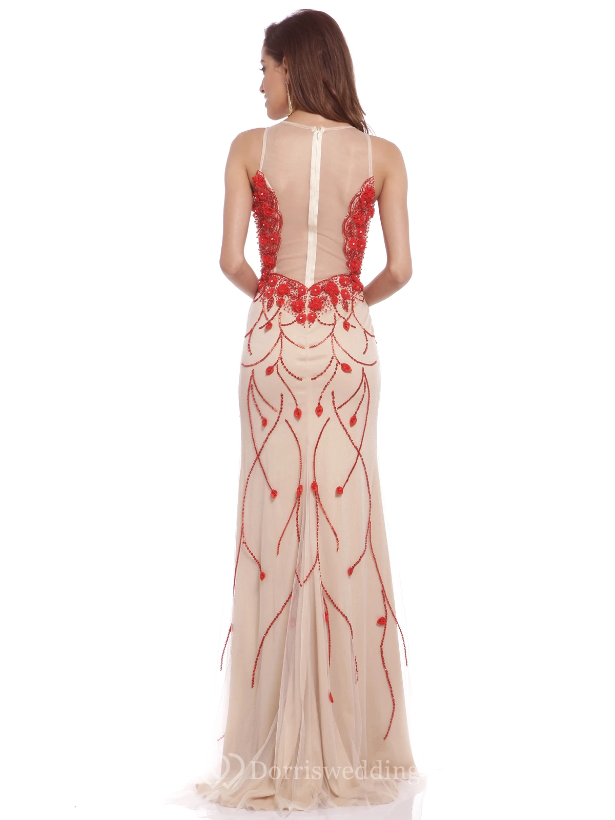 Sheath Scoop-Neck Sleeveless Satin Illusion Dress With Beading And Flower