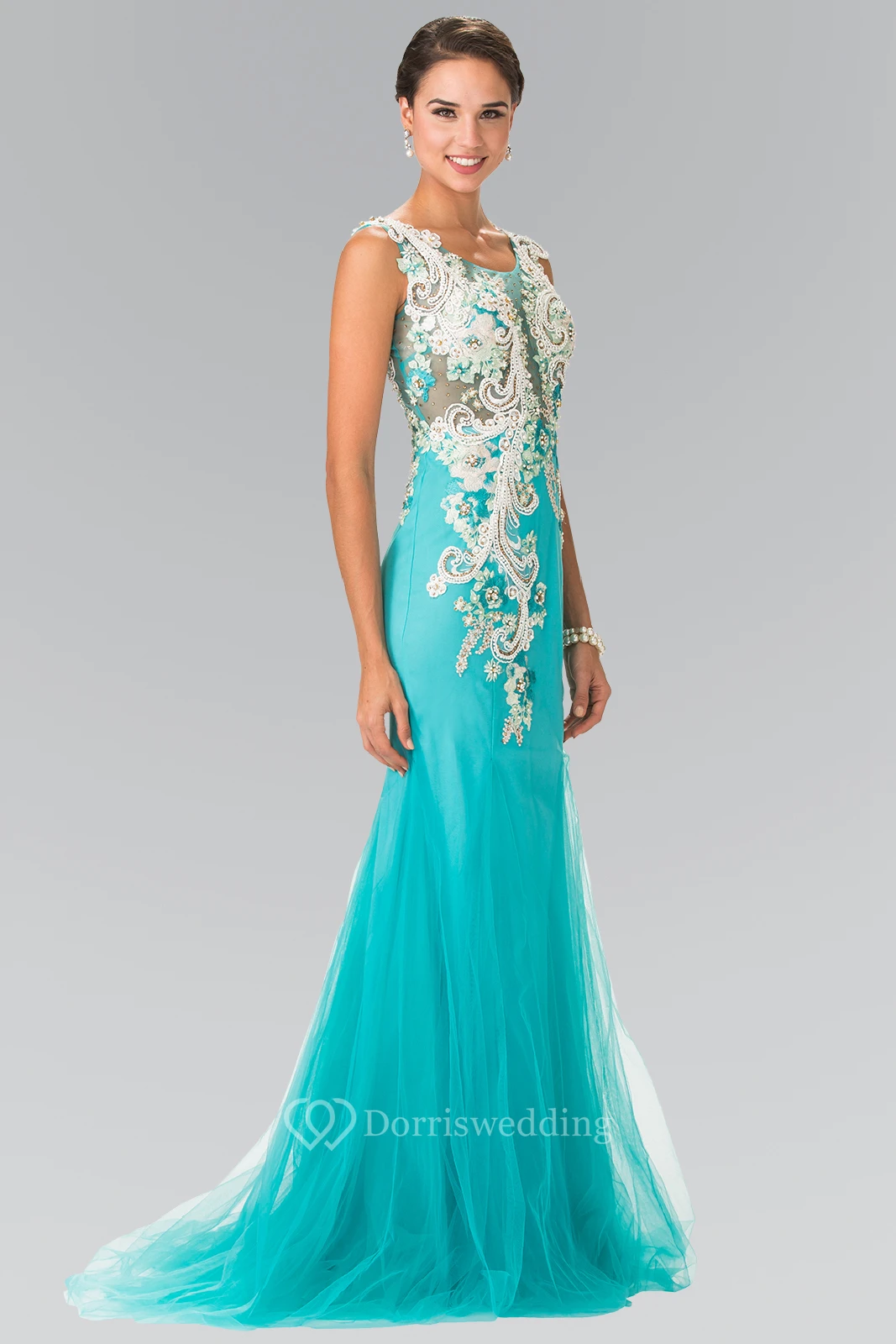 Sheath Scoop-Neck Tulle Illusion Dress With Appliques And Crystal Detailing