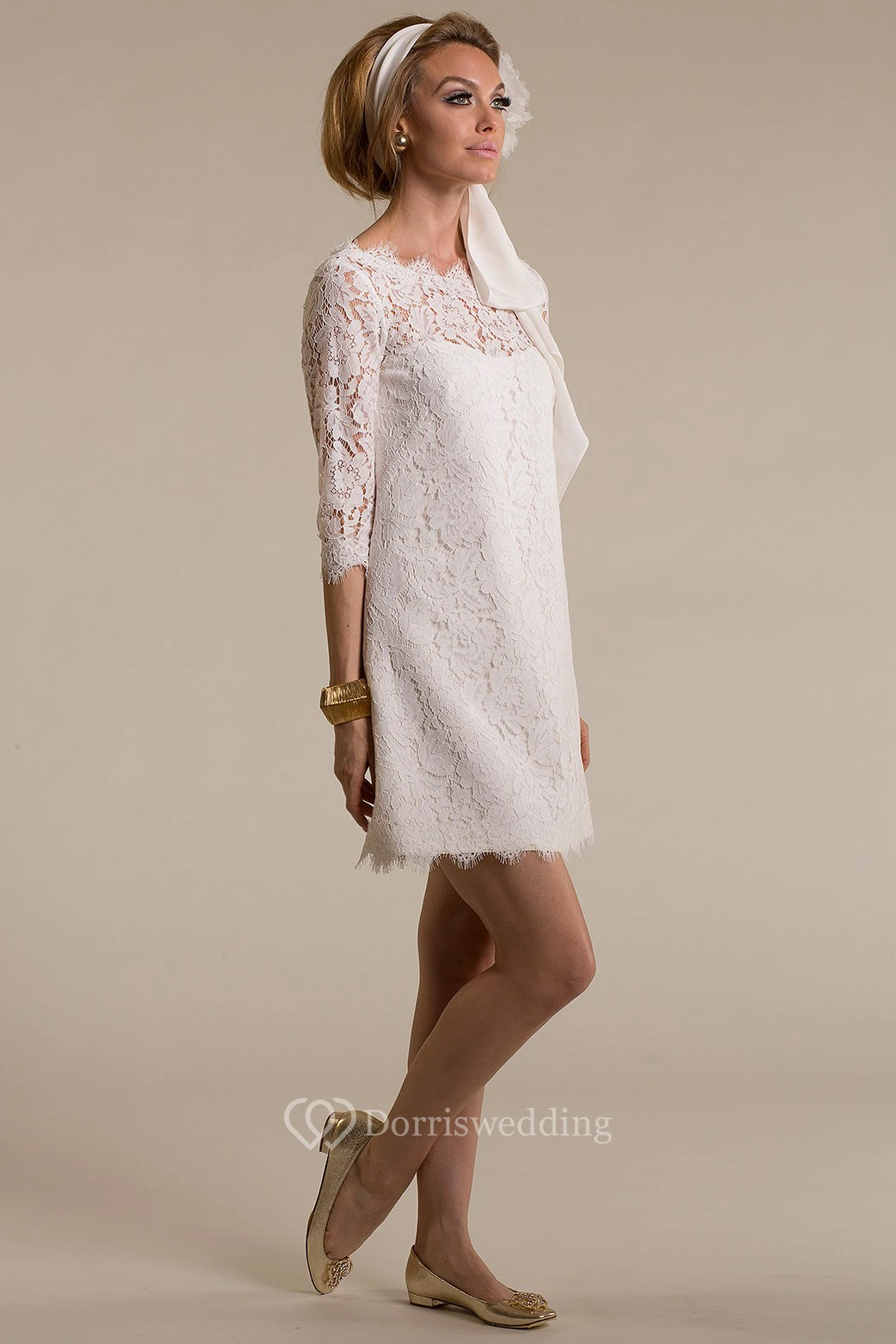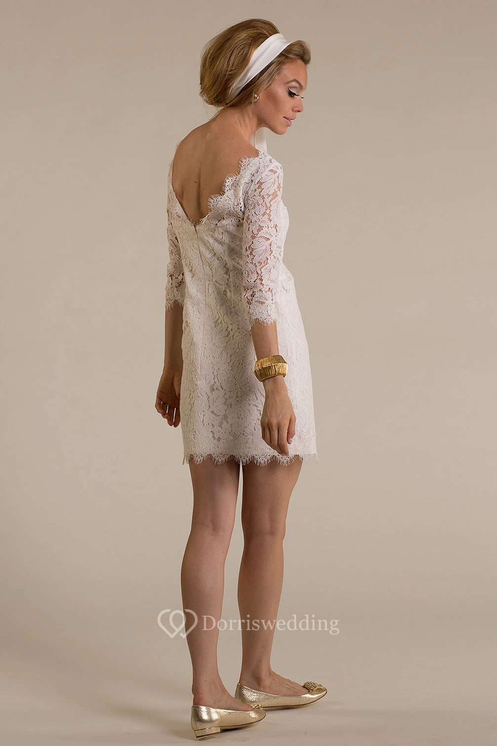 Sheath Short Scoop-Neck 3-4-Sleeve Lace Wedding Dress With Appliques And V Back