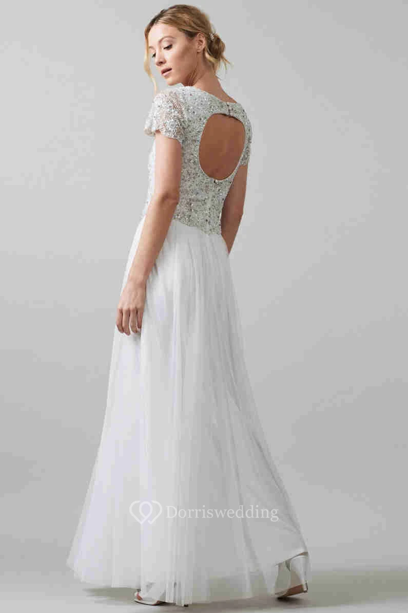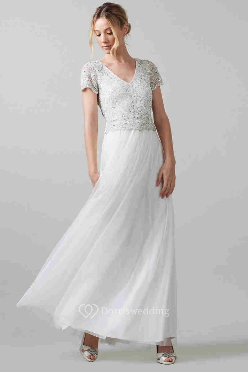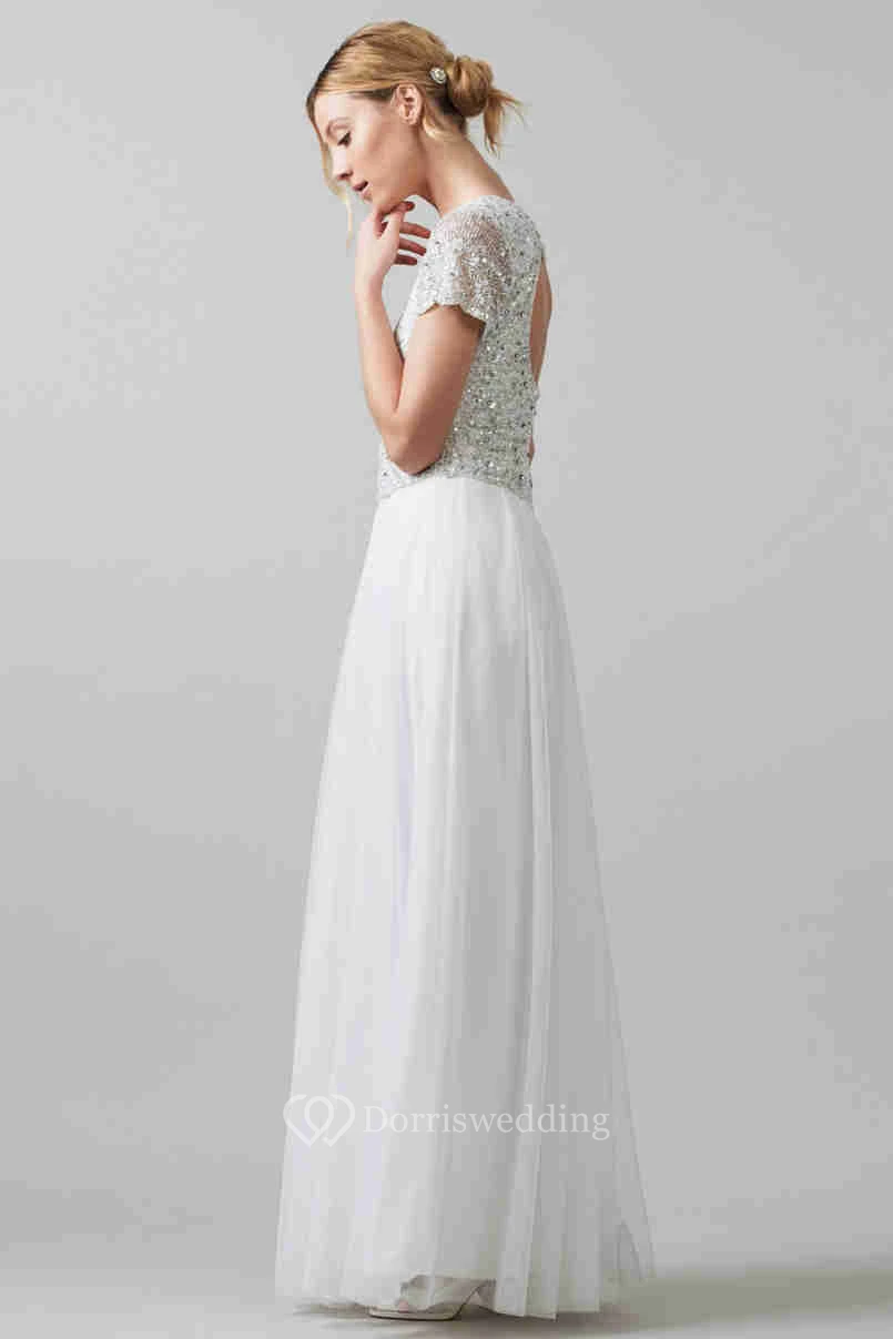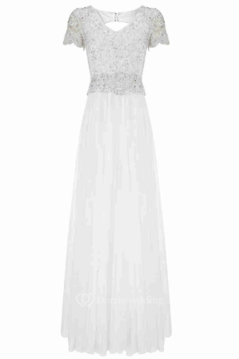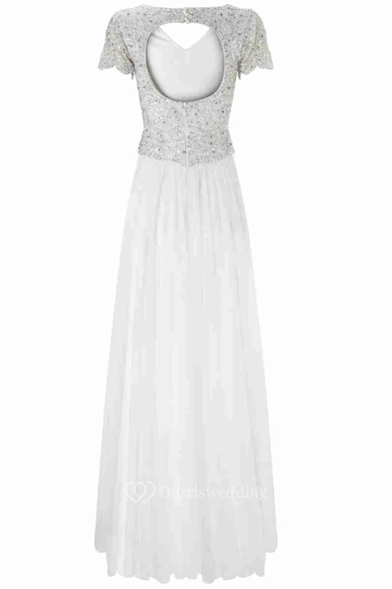 Sheath Short-Sleeve Long V-Neck Chiffon Wedding Dress With Sequins And Keyhole
