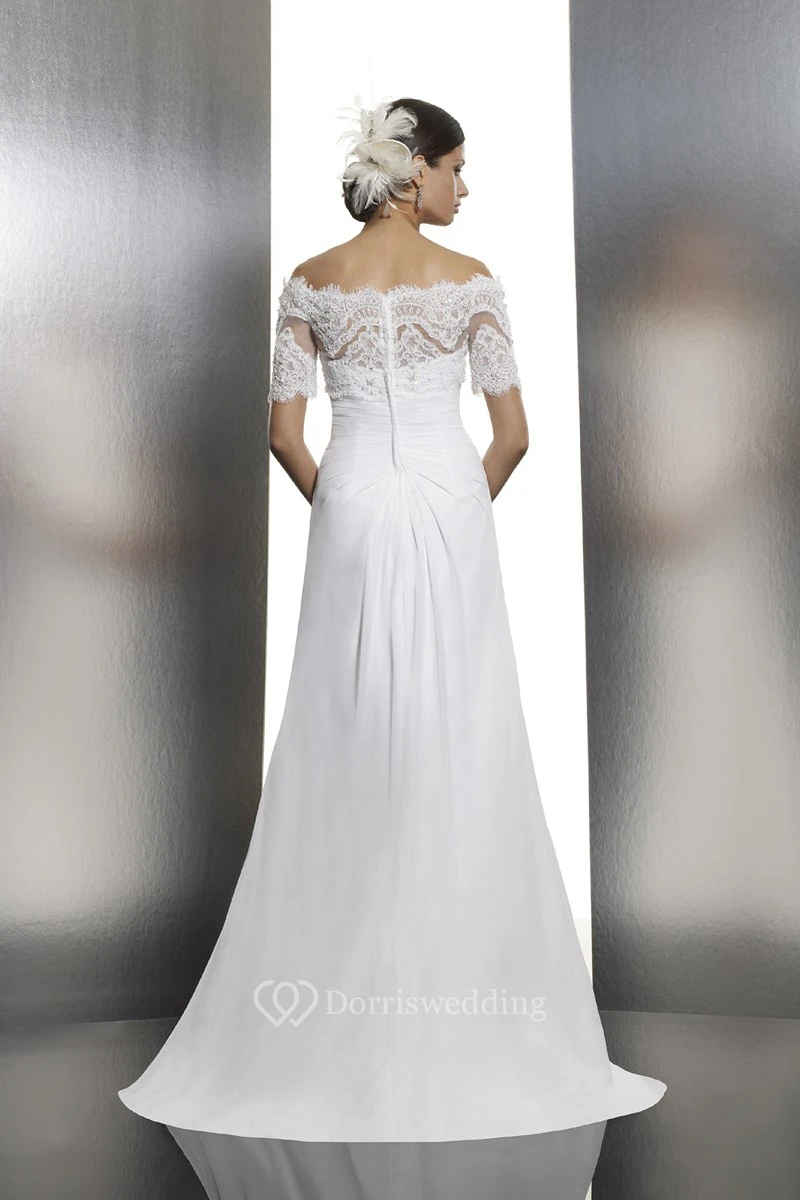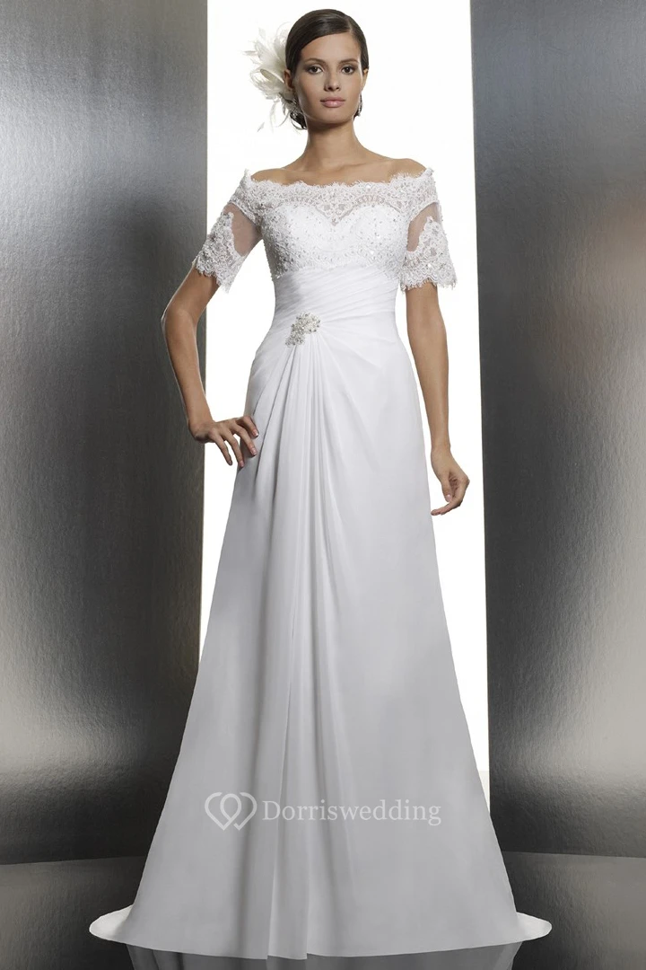Sheath Short-Sleeve Off-The-Shoulder Appliqued Floor-Length Chiffon Wedding Dress With Beading And Broach