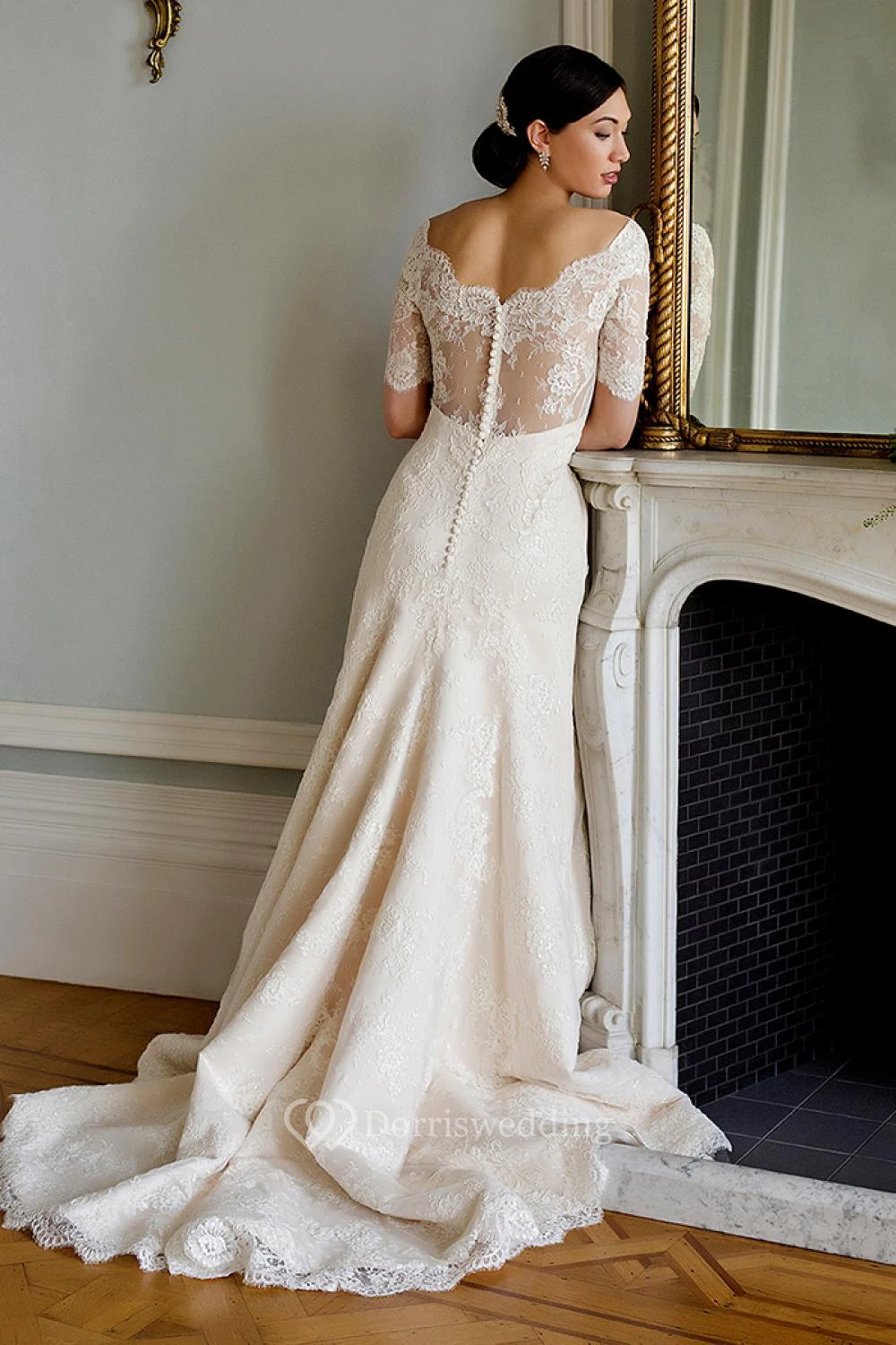 Sheath Short-Sleeve Scoop-Neck Lace Wedding Dress With Illusion