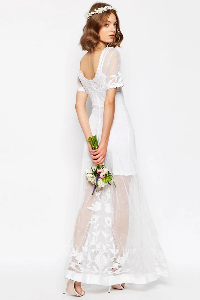 Sheath Short-Sleeve Scoop-Neck Long Tulle Wedding Dress With Embroidery And V Back