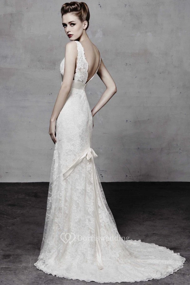 Sheath Sleeveless Appliqued Floor-Length Lace Wedding Dress With Bow And Low-V Back