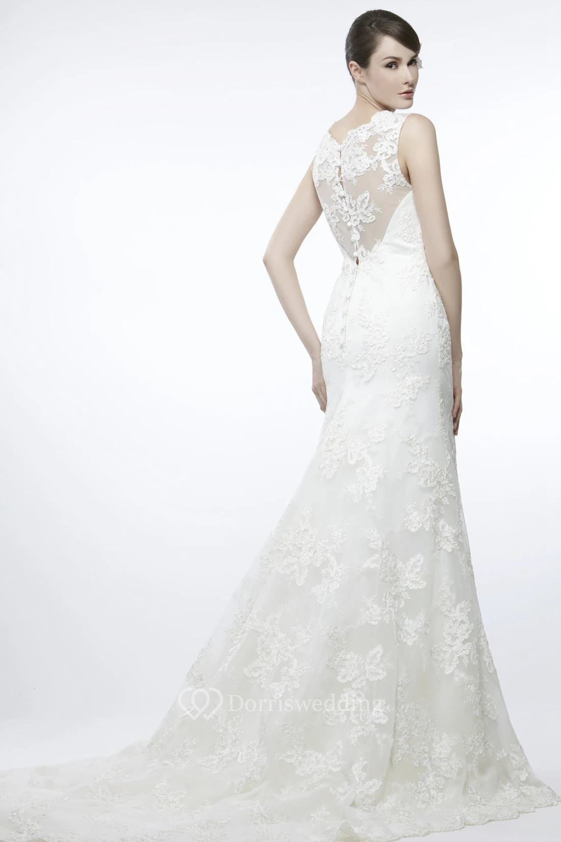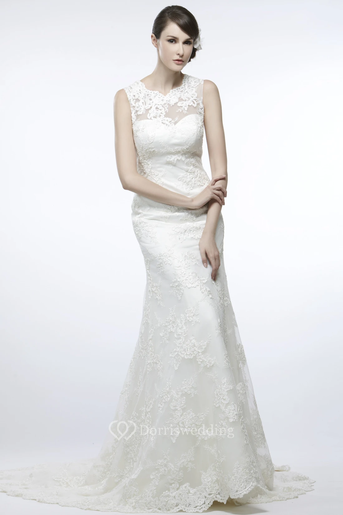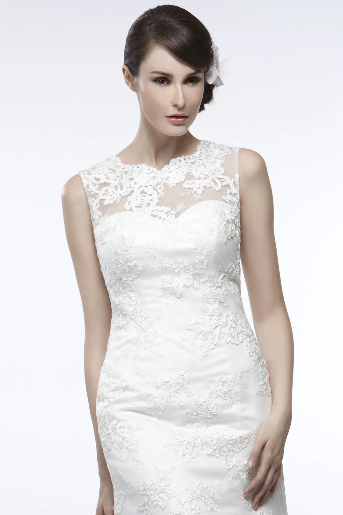 Sheath Sleeveless Appliqued Floor-Length Scoop Lace Wedding Dress With Illusion Back And Court Train