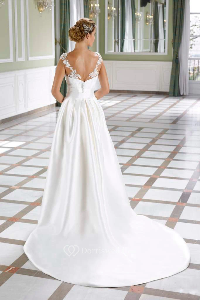 Sheath Sleeveless Bateau Floor-Length Satin&Lace Wedding Dress With Low-V Back