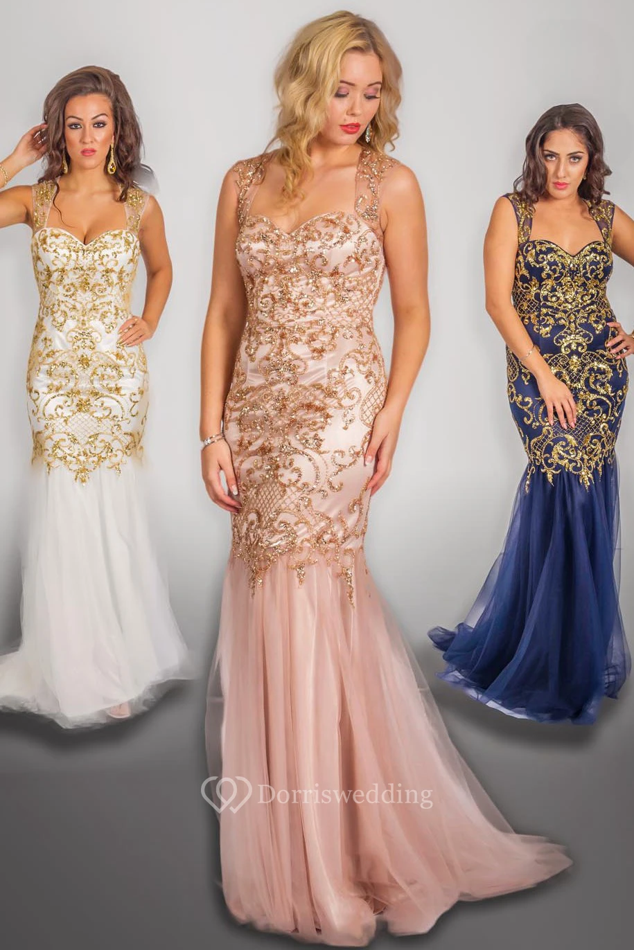 Sheath Sleeveless Beaded Long Strapped Tulle&Satin Prom Dress With Sequins