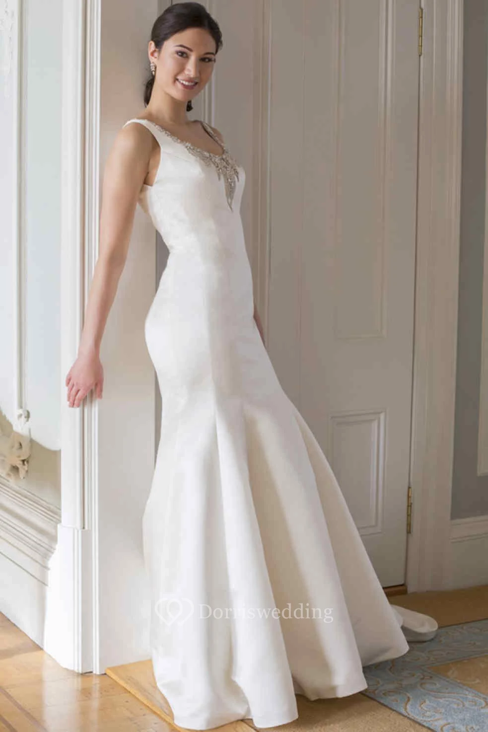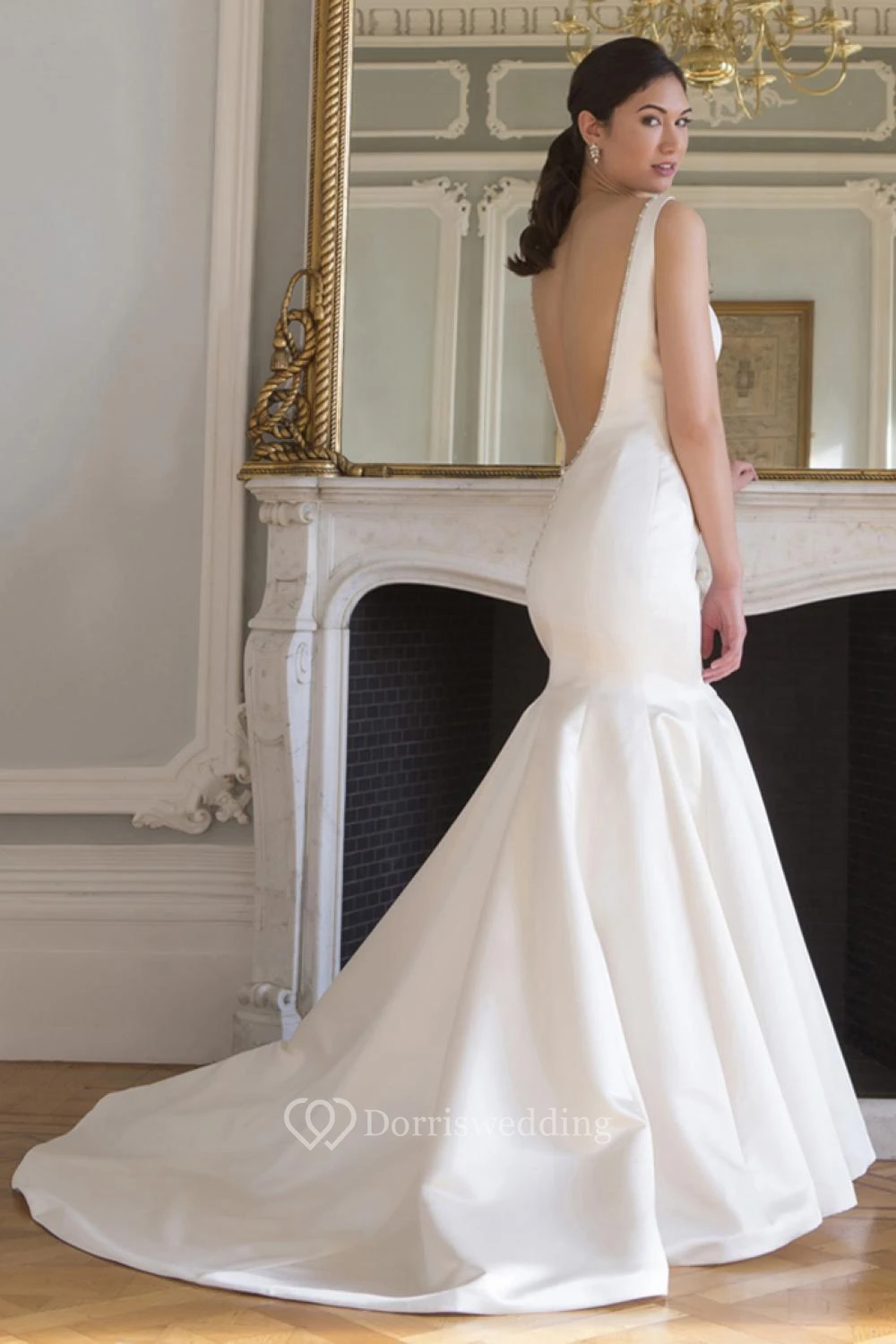 Sheath Sleeveless Beaded V-Neck Long Stretched Satin Wedding Dress