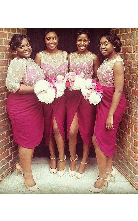 Sheath Sleeveless Bell Bat Split Front Embroidery Chiffon Lace Bridesmaid Dress