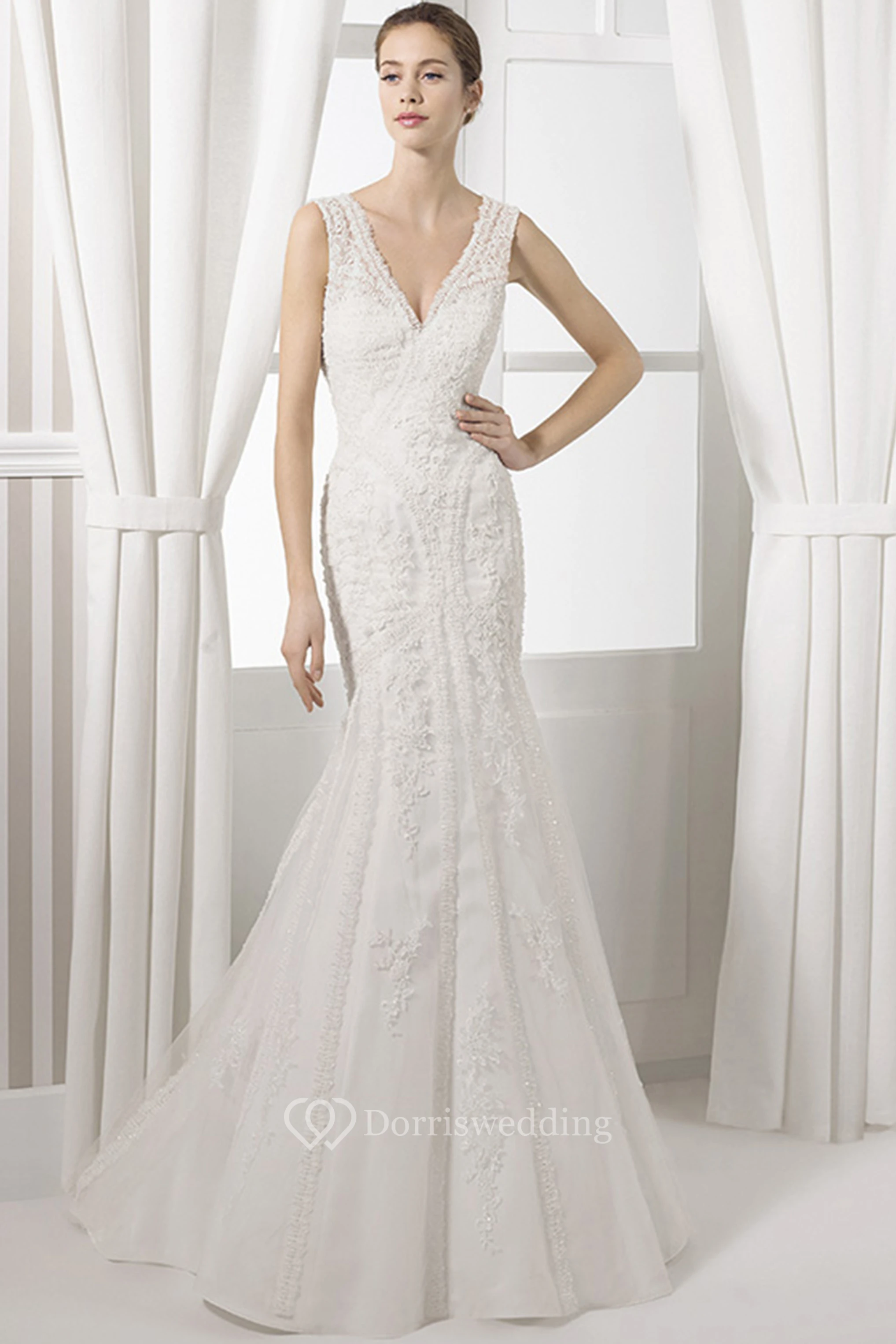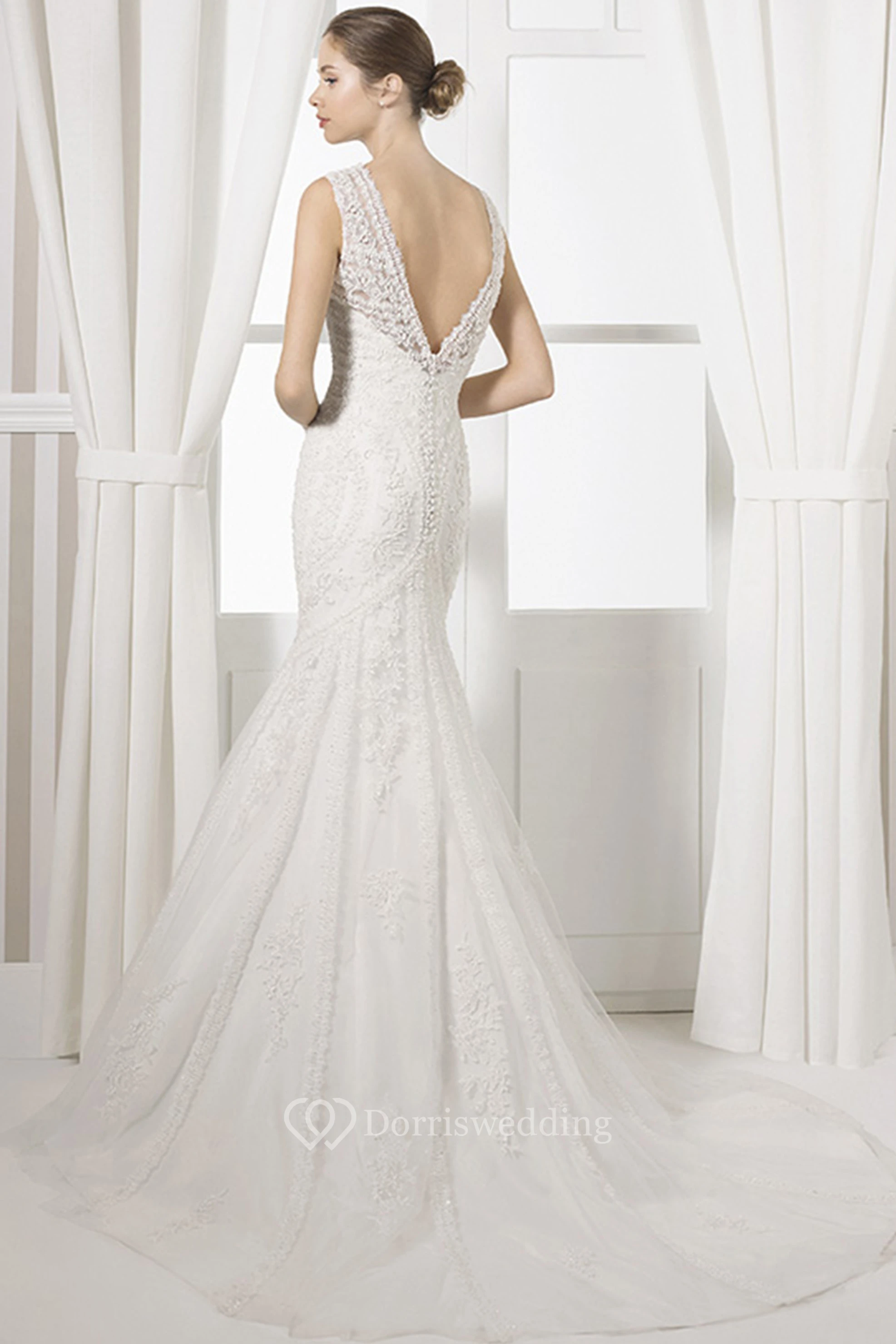 Sheath Sleeveless Floor-Length Appliqued V-Neck Lace Wedding Dress With Court Train And Low-V Back