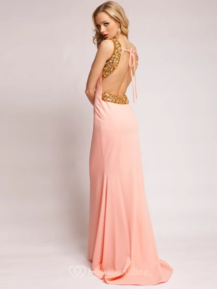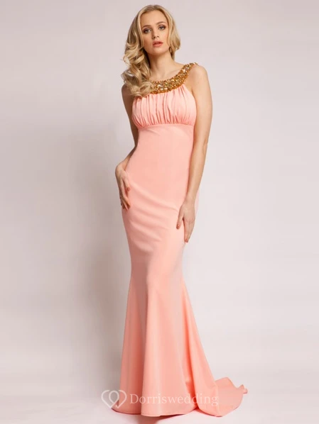 Sheath Sleeveless Floor-Length Scoop-Neck Beaded Jersey Prom Dress With Ruching
