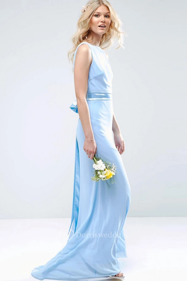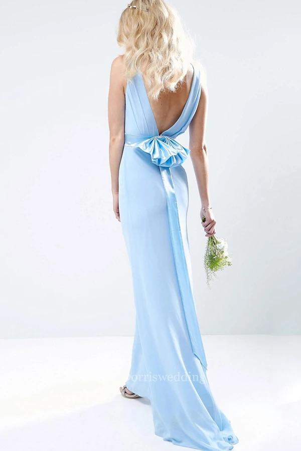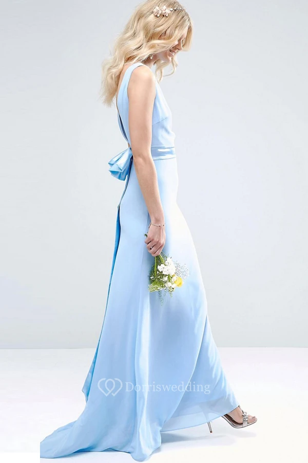 Sheath Sleeveless High Neck Chiffon Bridesmaid Dress With Bow And Deep-V Back