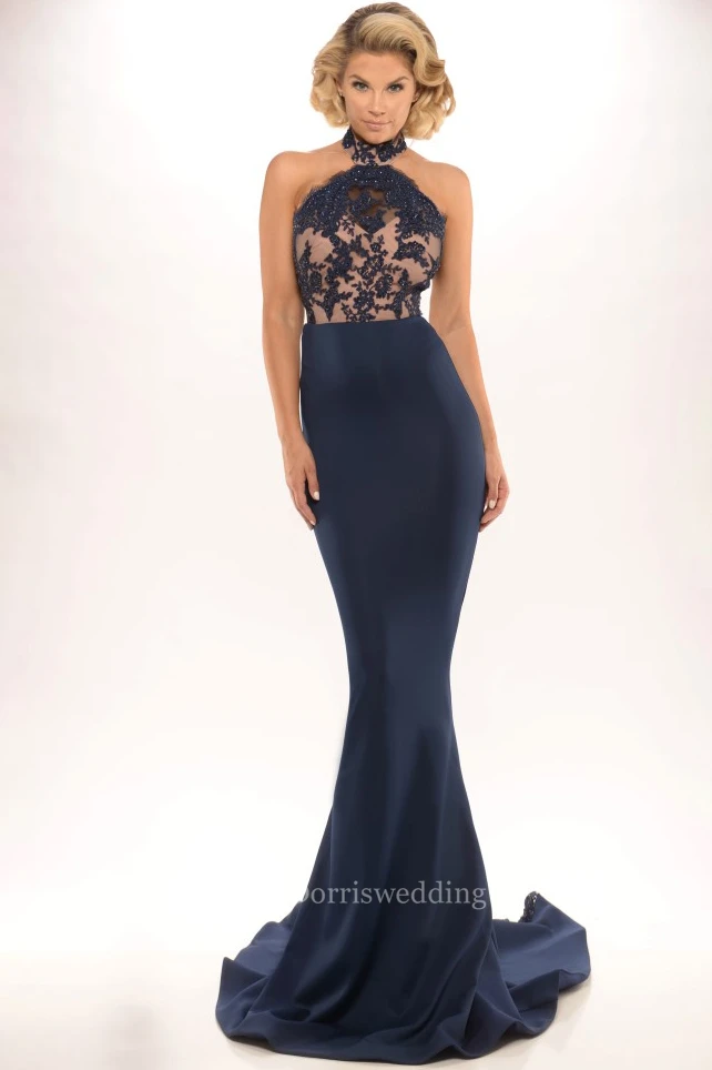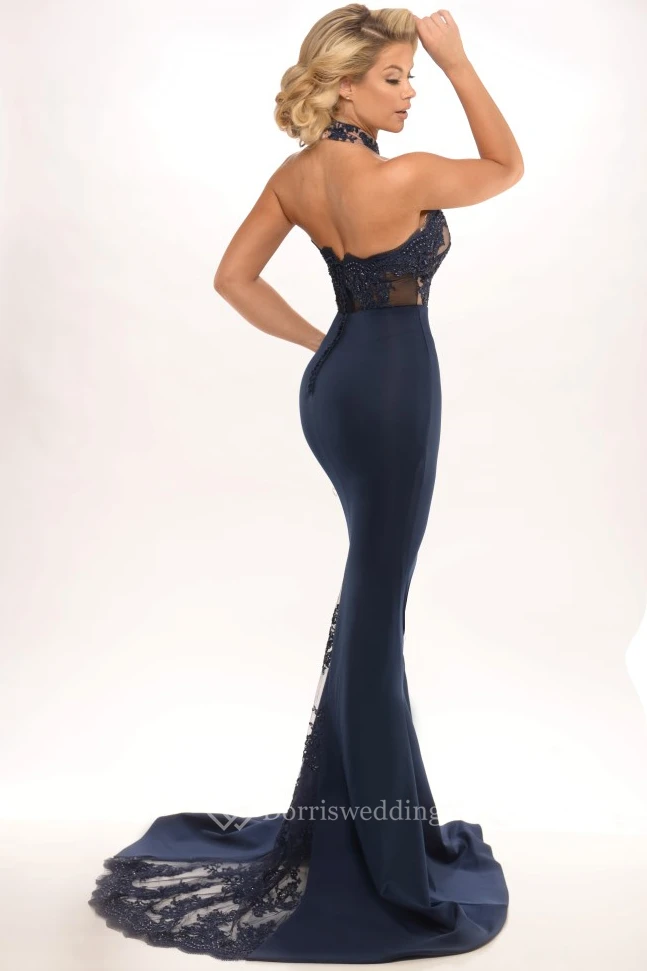 Sheath Sleeveless High Neck Lace Long Jersey Prom Dress With Backless Style And Brush Train