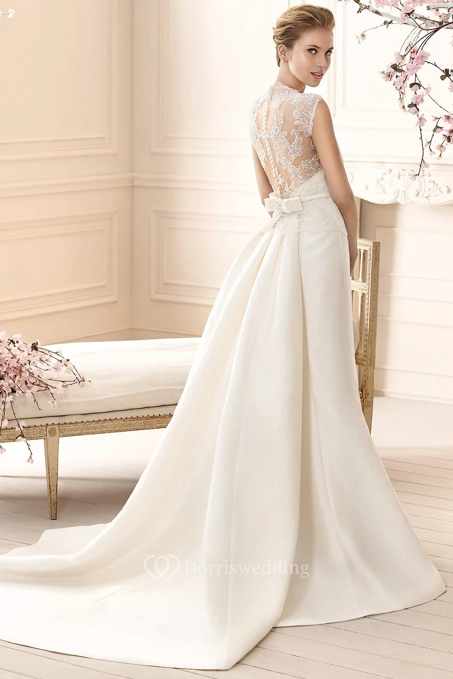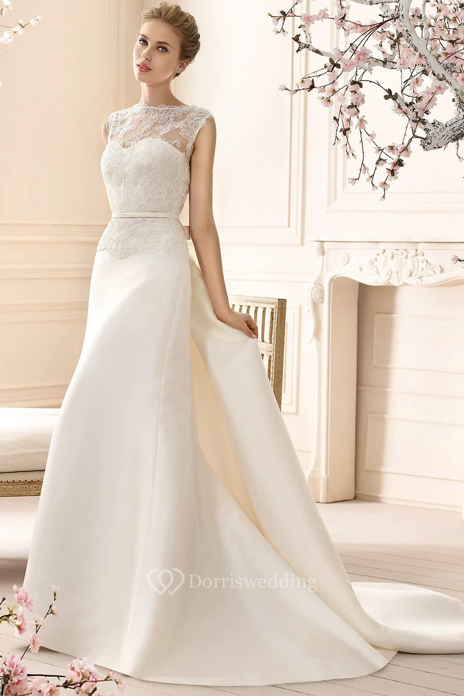 Sheath Sleeveless High-Neck Lace Long Satin Wedding Dress