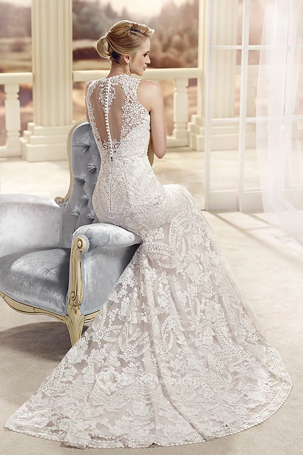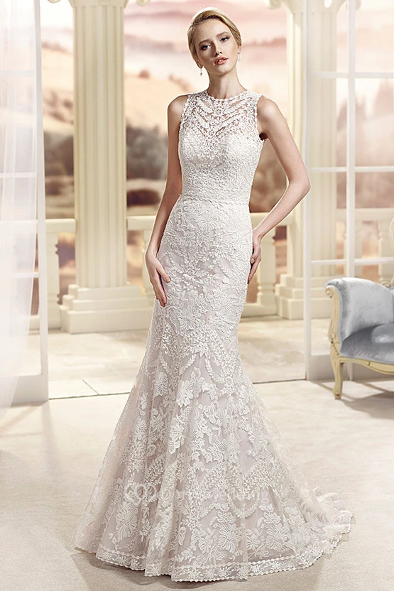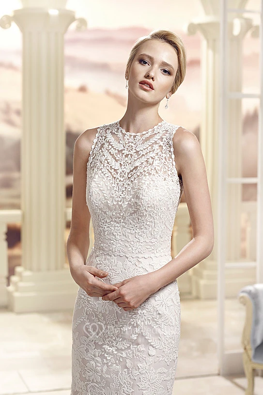 Sheath Sleeveless High Neck Lace Wedding Dress With Illusion