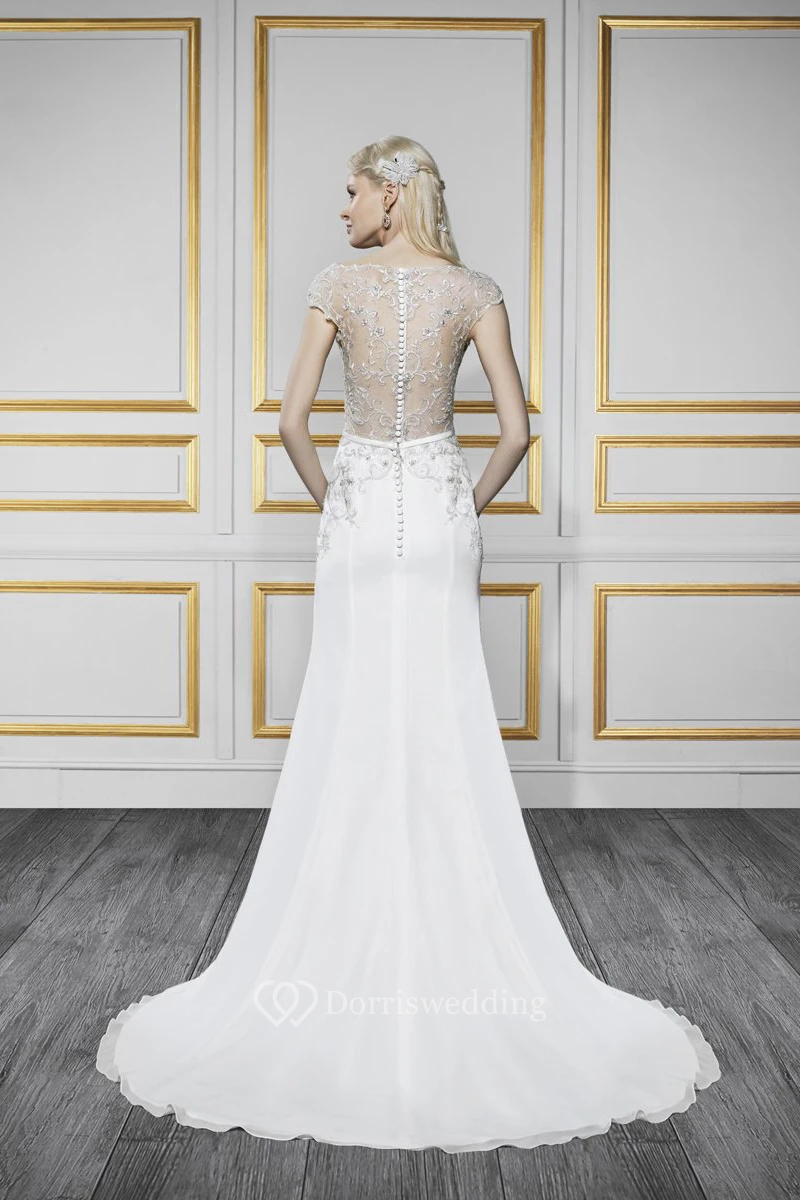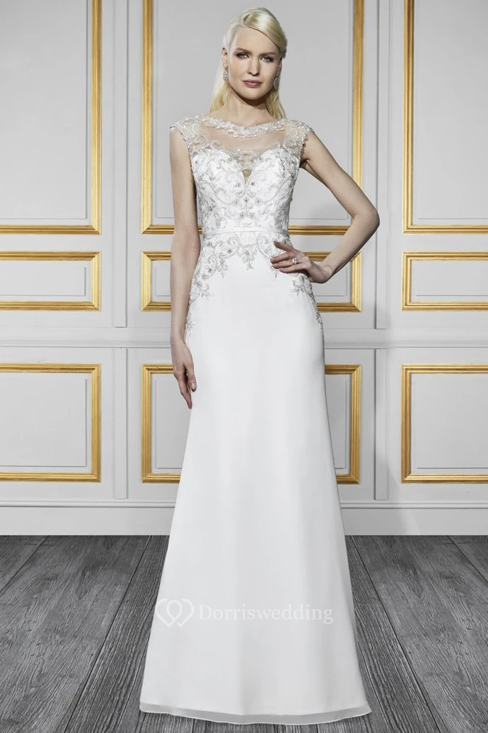 Sheath Sleeveless Jewel-Neck Embroidered Long Satin&Tulle Wedding Dress With Beading And Illusion