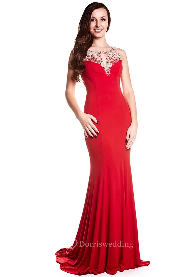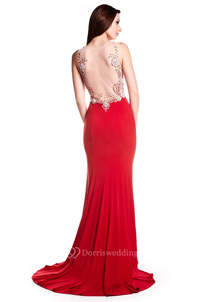 Sheath Sleeveless Long Scoop Beaded Chiffon Prom Dress With Illusion Back And Brush Train